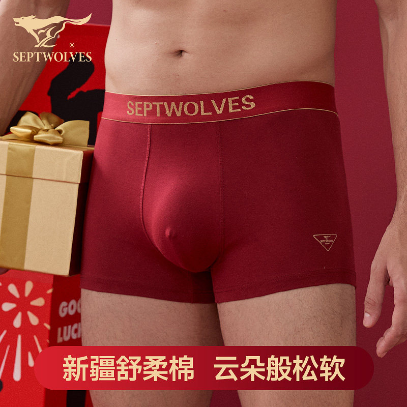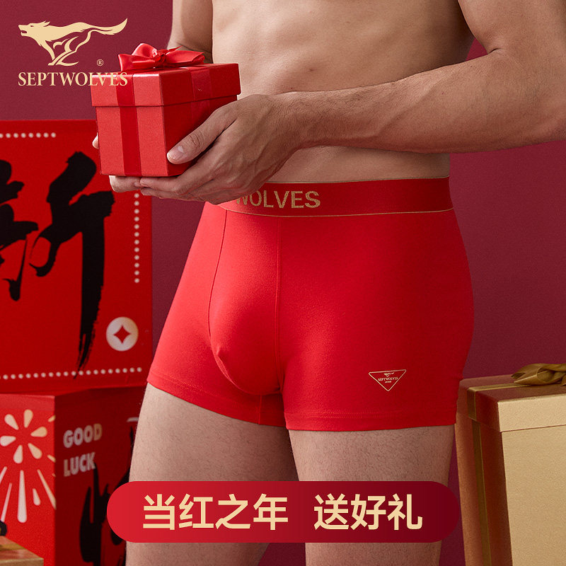 七匹狼男士内裤本命年纯棉四角短裤酒红色裤衩子男生结婚新年礼盒