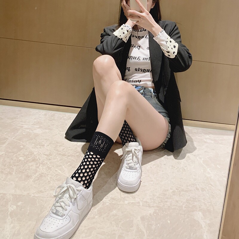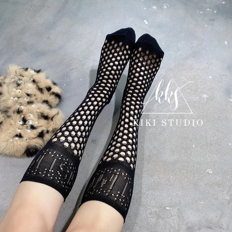 夏季欧货超薄洞洞袜子D字母镂空渔网眼中筒袜女个性潮流ins堆堆袜