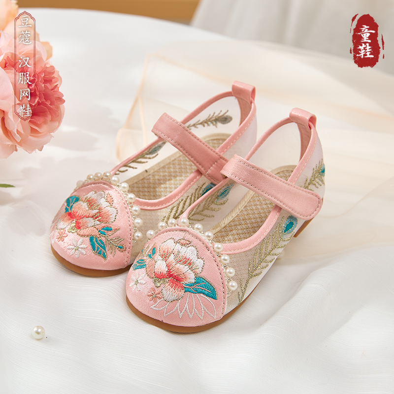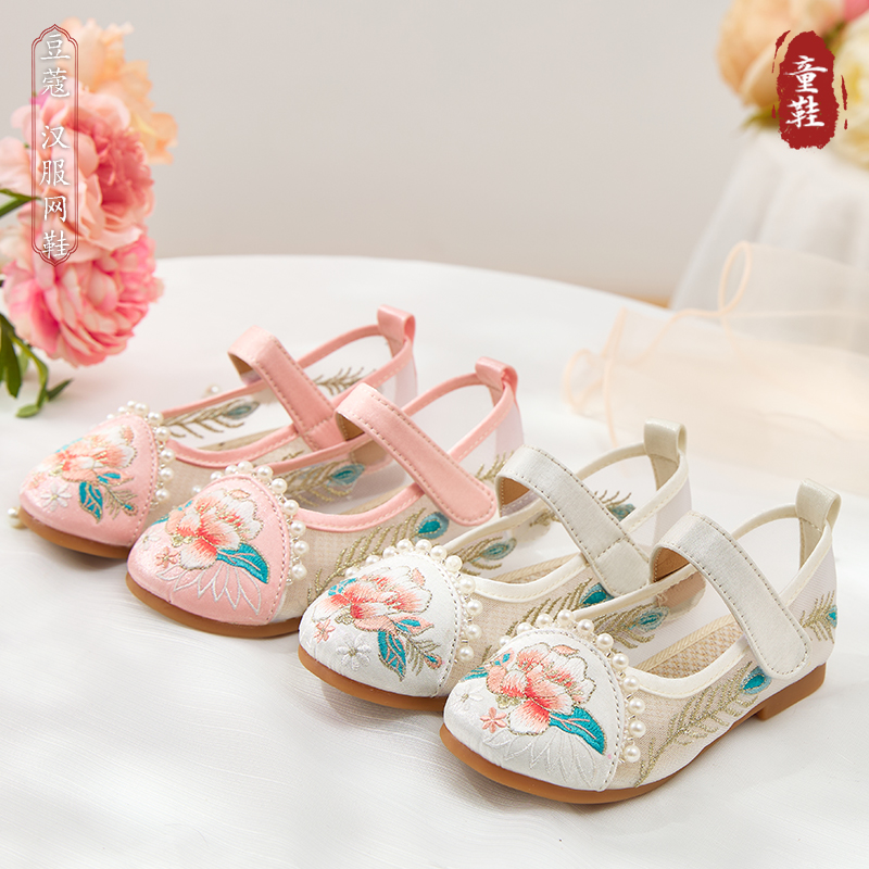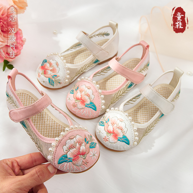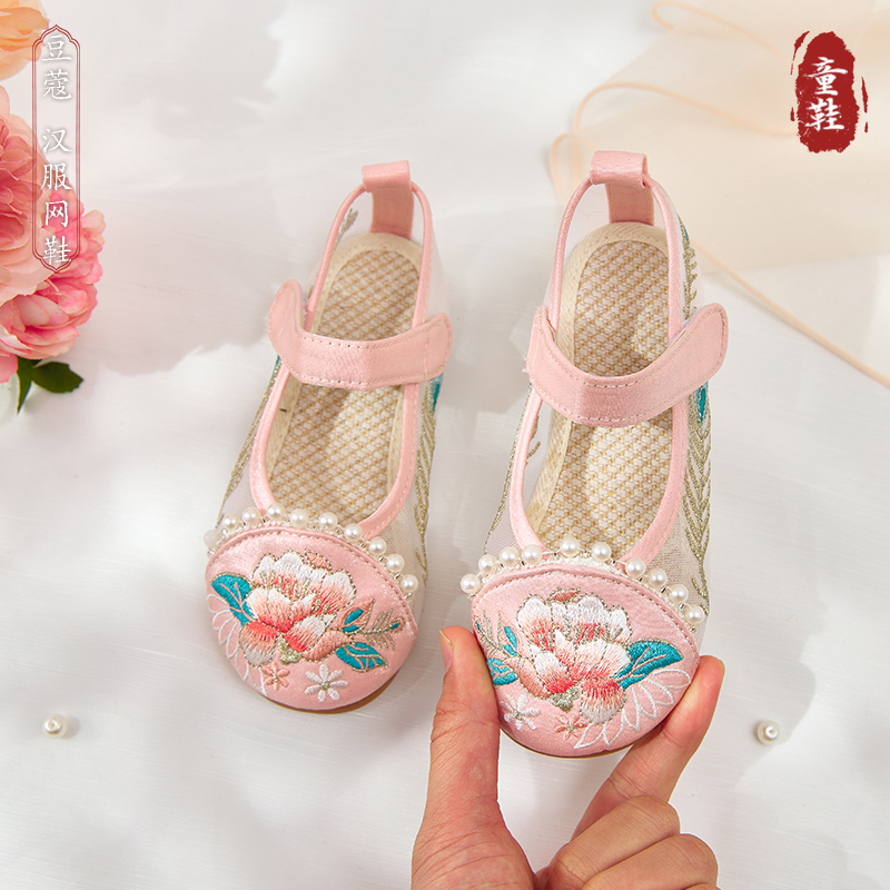 夏季女童汉服鞋子中国风古装绣花鞋儿童老北京手工布鞋网纱透气