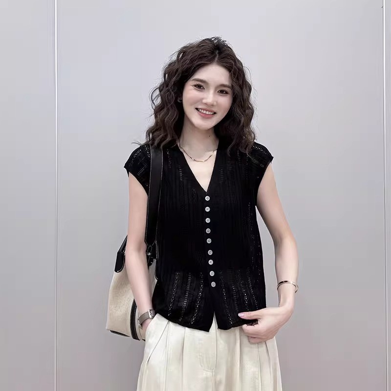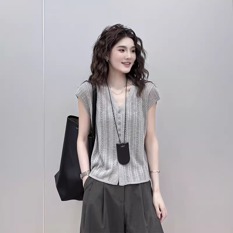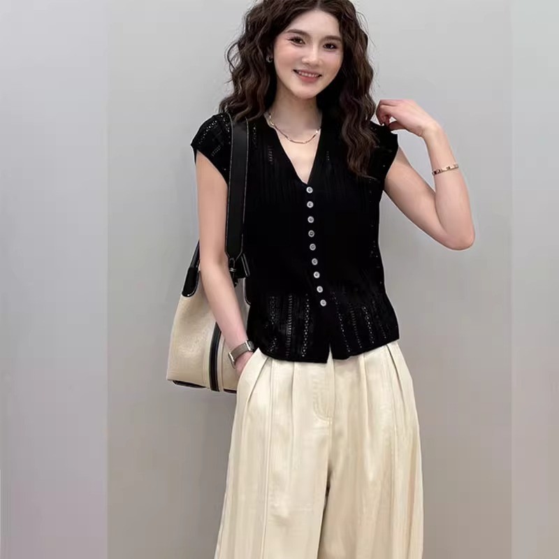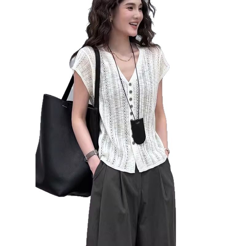 胖东来小香风v领冰丝针织短袖女2025新款夏季宽松薄款镂空外搭罩