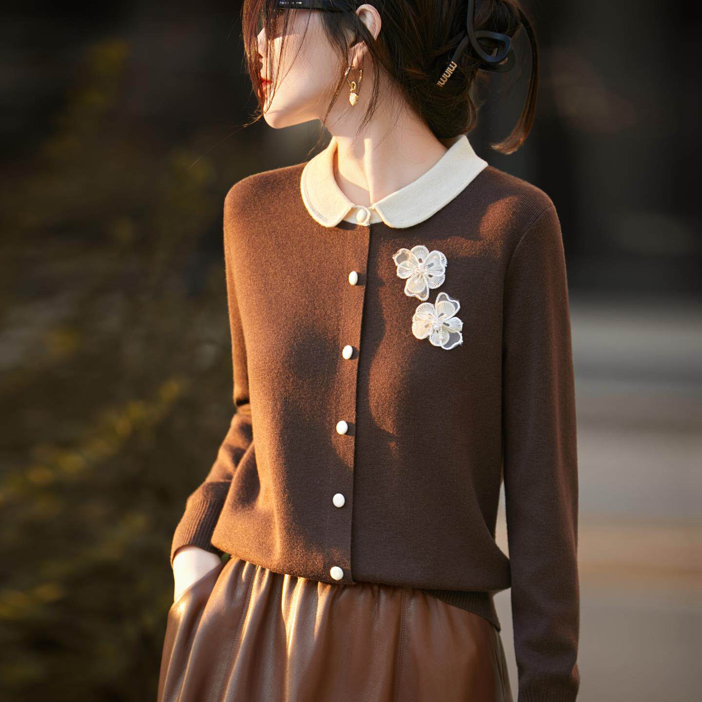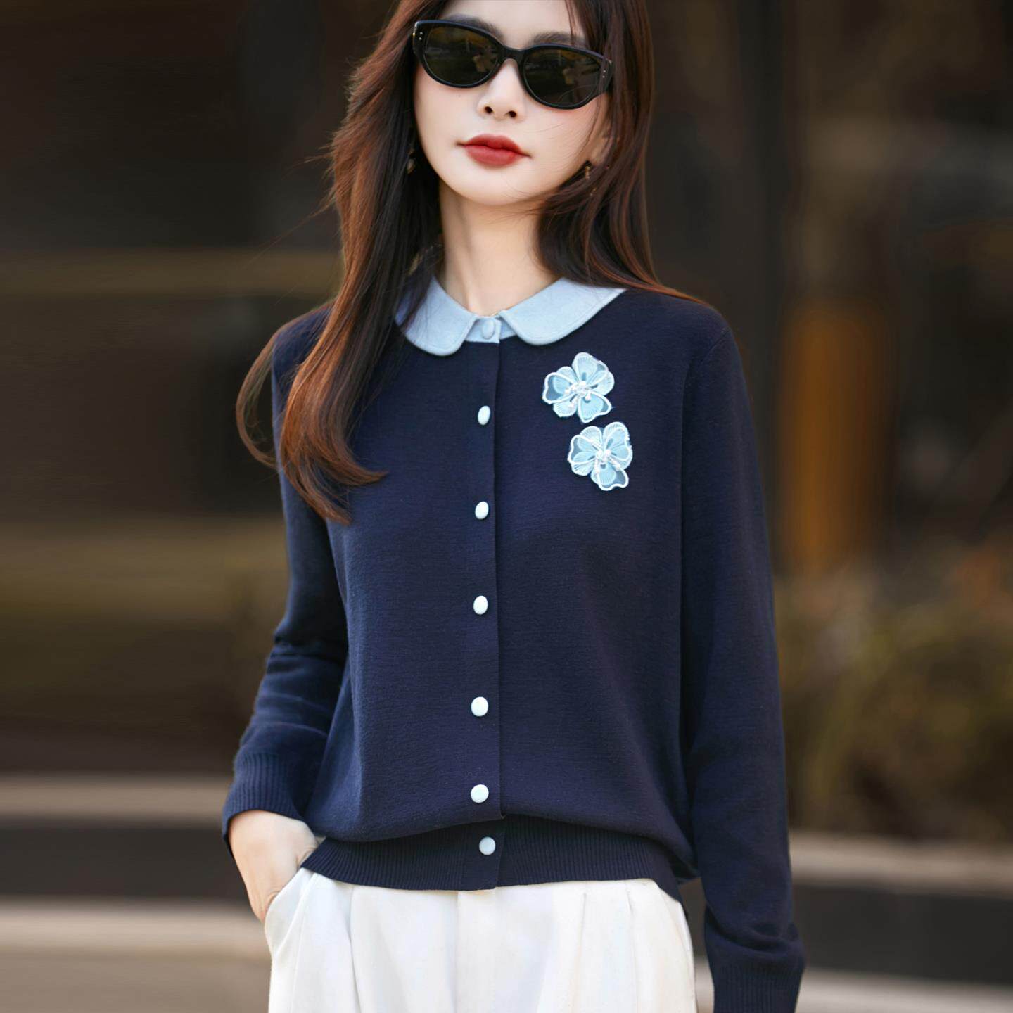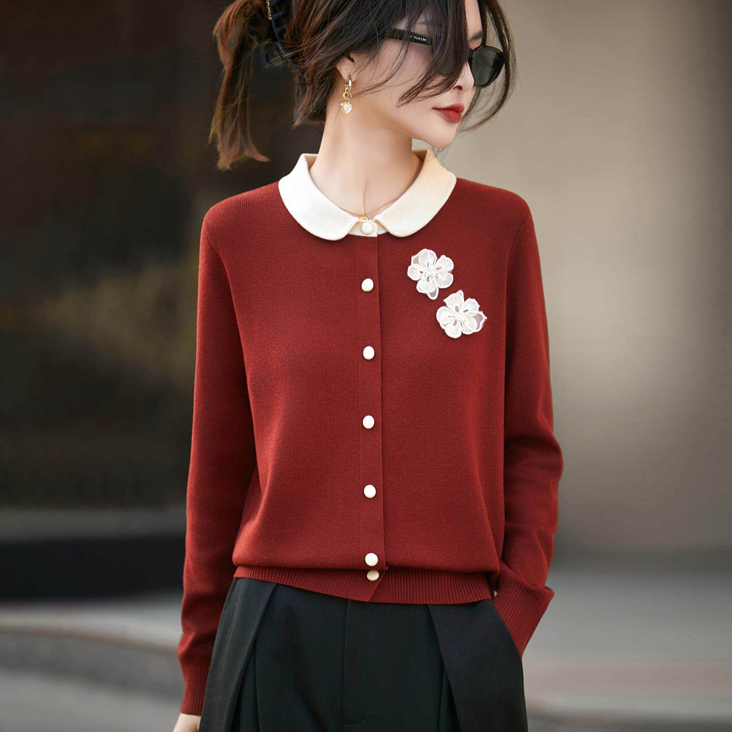 2025秋冬精纺羊毛针织开衫女翻领小香风立体花朵外套宽松拼色毛衣