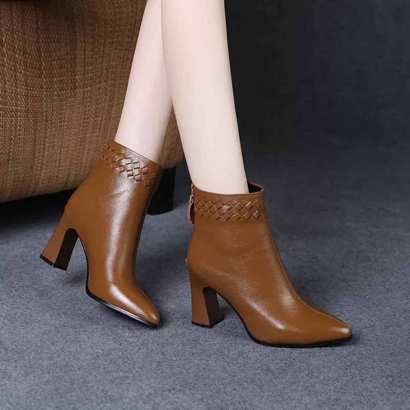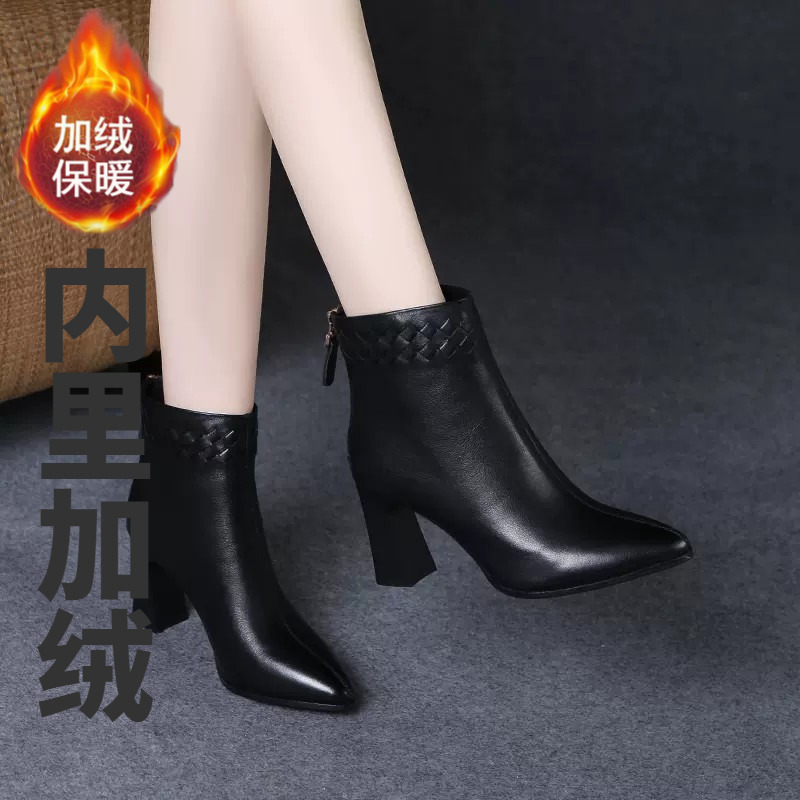 2025新款春春季尖头高跟鞋女粗跟真皮小短靴秋冬女鞋软皮马丁靴子