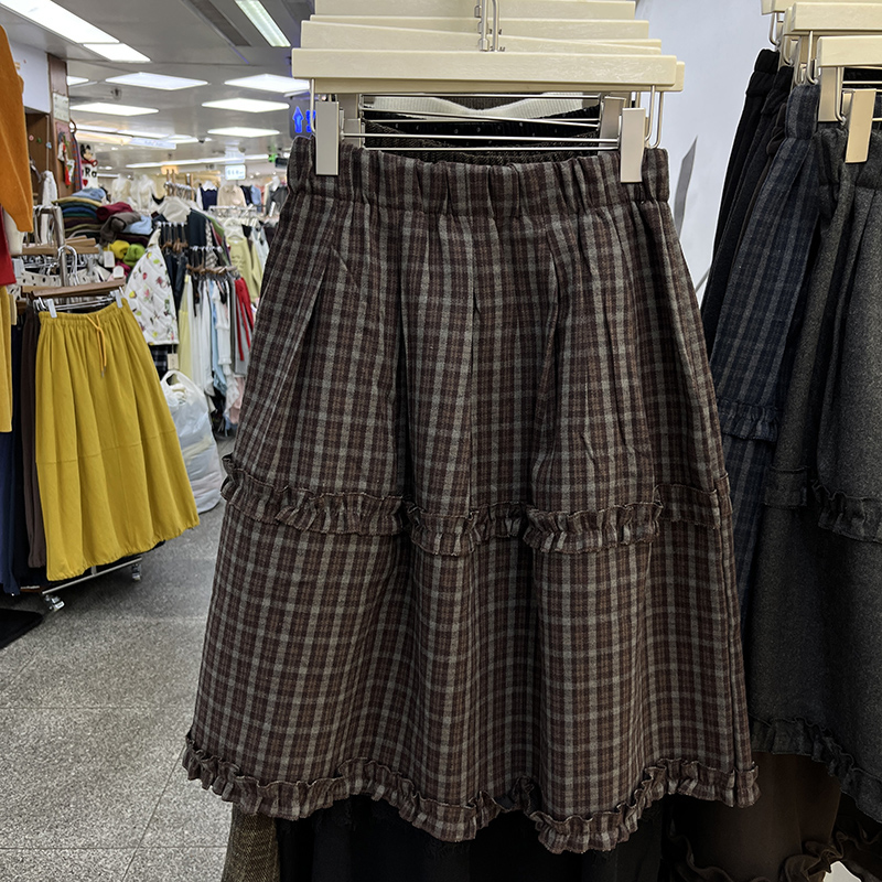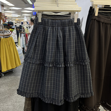 韩国文艺格子木耳边半身裙高腰显瘦A字中裙25秋冬小众设计感靴裙