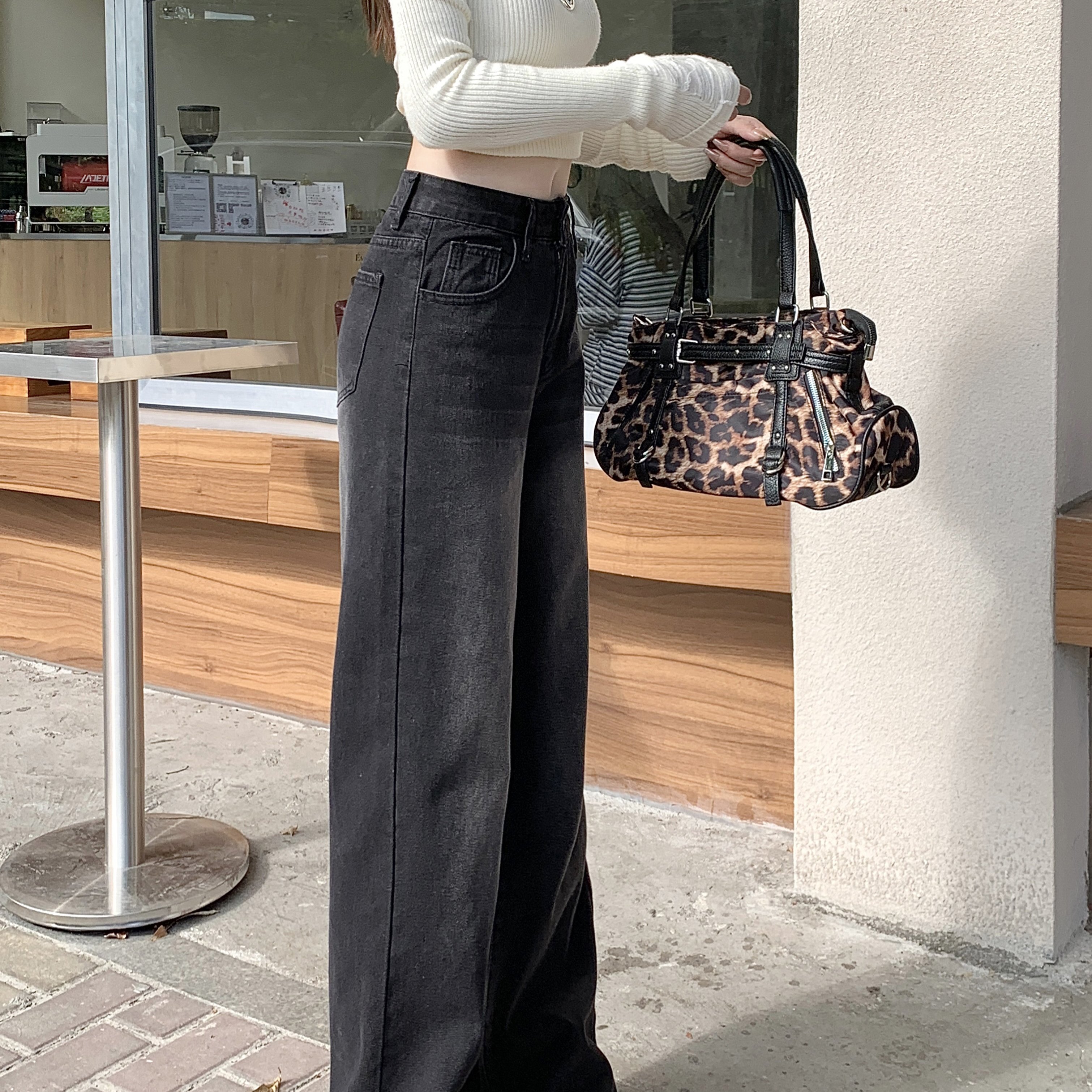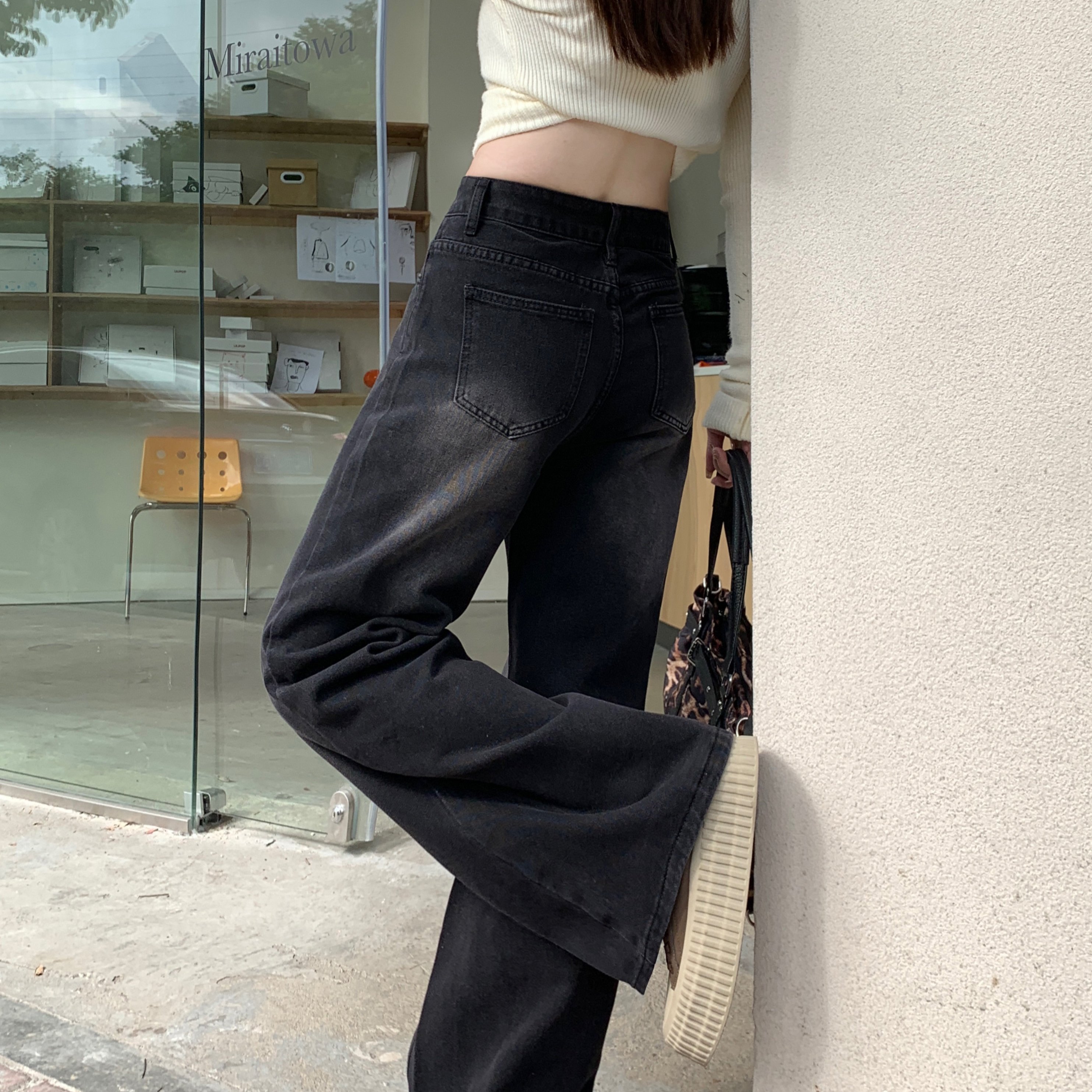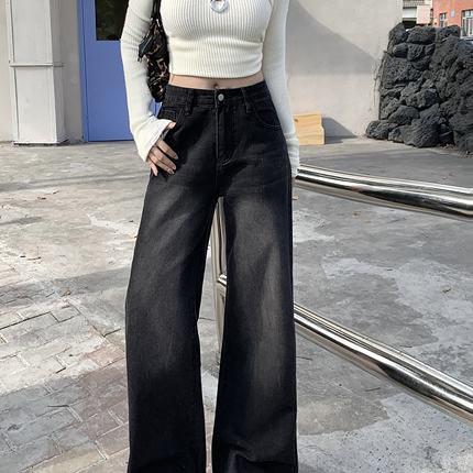 实拍实价黑灰色垂感阔腿牛仔裤女秋季复古水洗高腰直筒拖地裤子