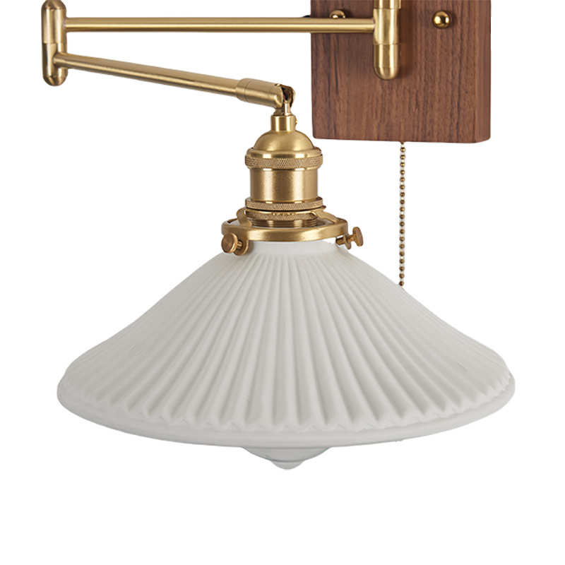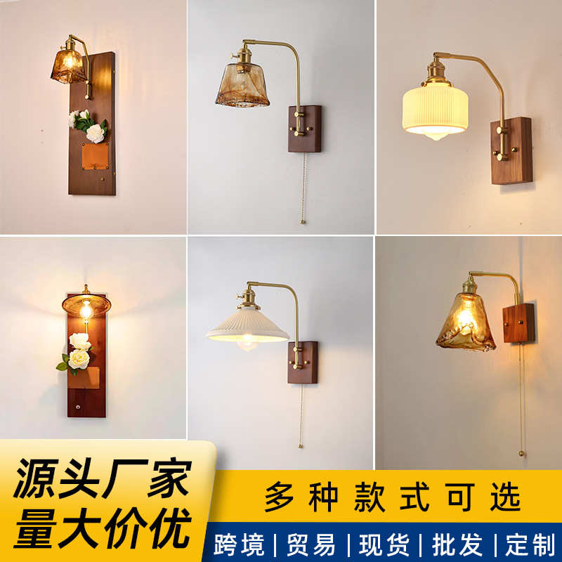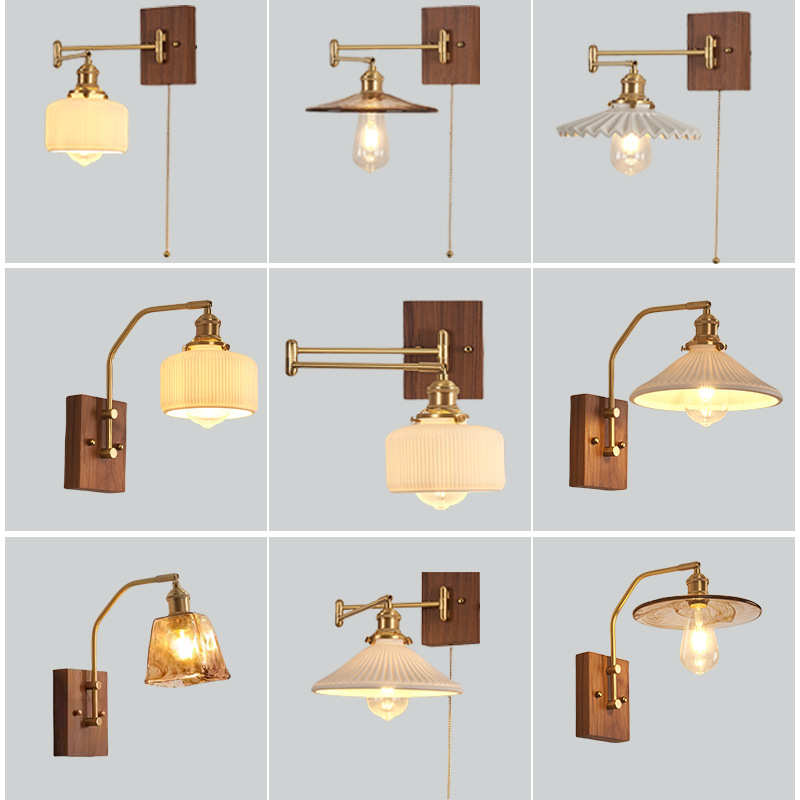 中古风胡桃木全铜摇臂酒店客厅卧室复古玻璃墙壁灯室内床头高级感