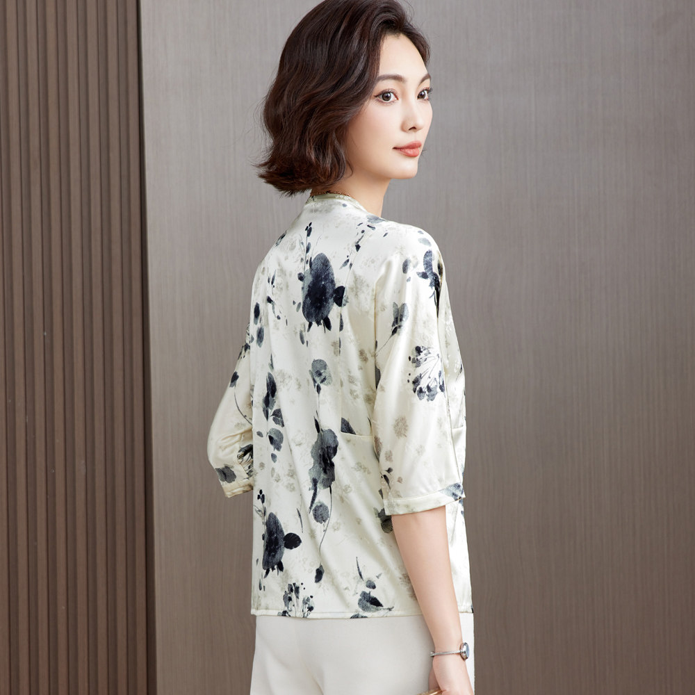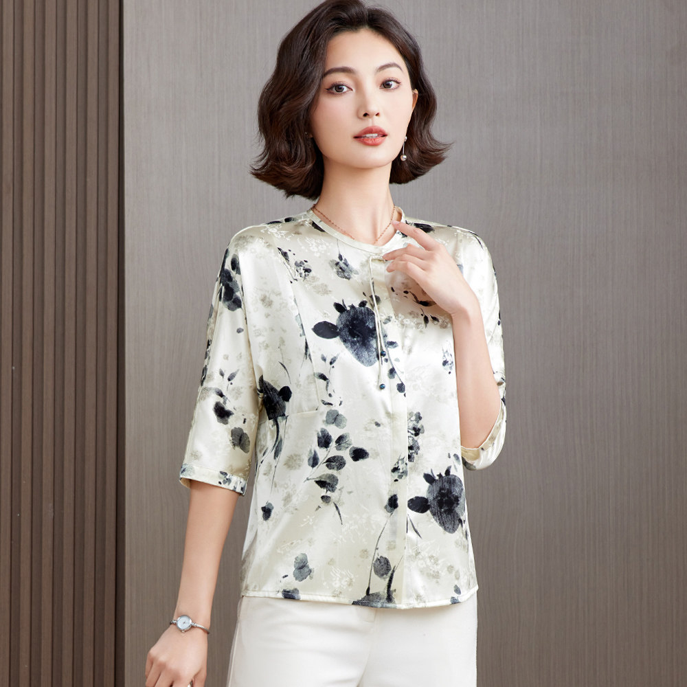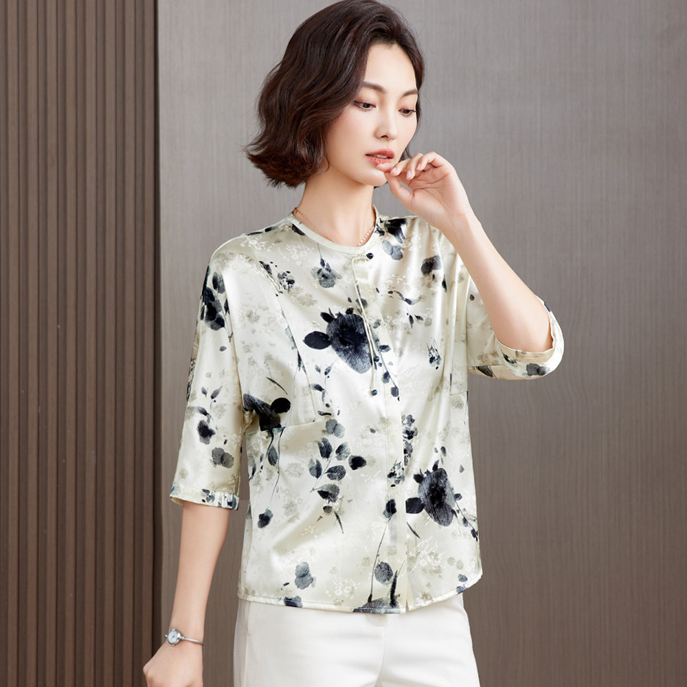 重磅真丝上衣女2025夏季新款复古印花妈妈装中袖桑蚕丝小衫