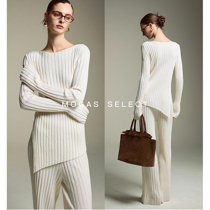Mogas显瘦时髦精100纯羊毛一字领坑条毛衣垂顺直筒裤针织套装女冬