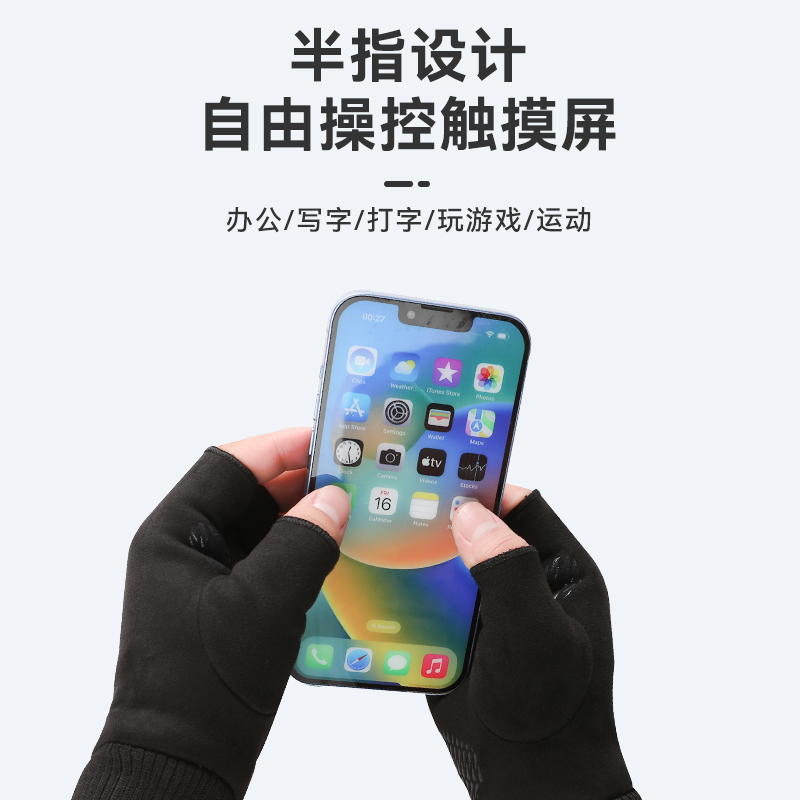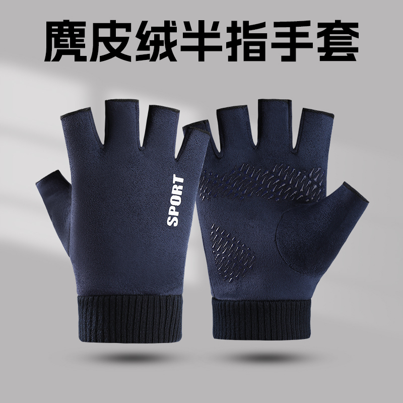 男女秋冬季学生写字手套麂皮绒半指加绒保暖手套运动骑车开车露指