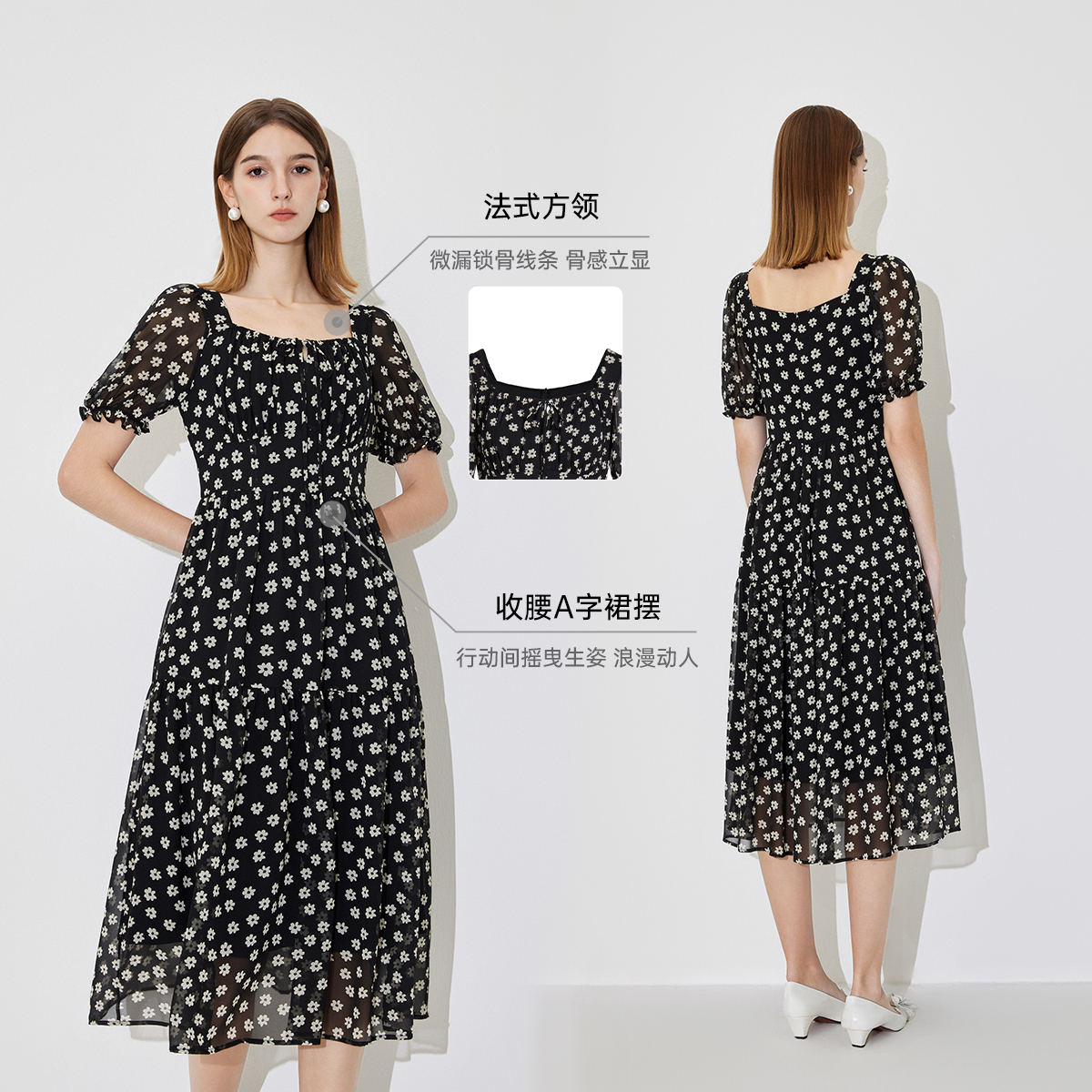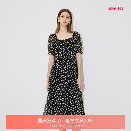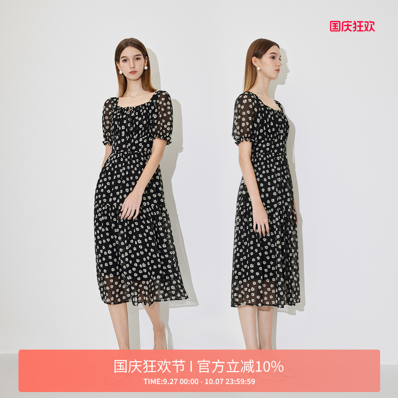 FIVE PLUS连衣裙女雪纺碎花裙子中长高腰方领法式新款女夏装
