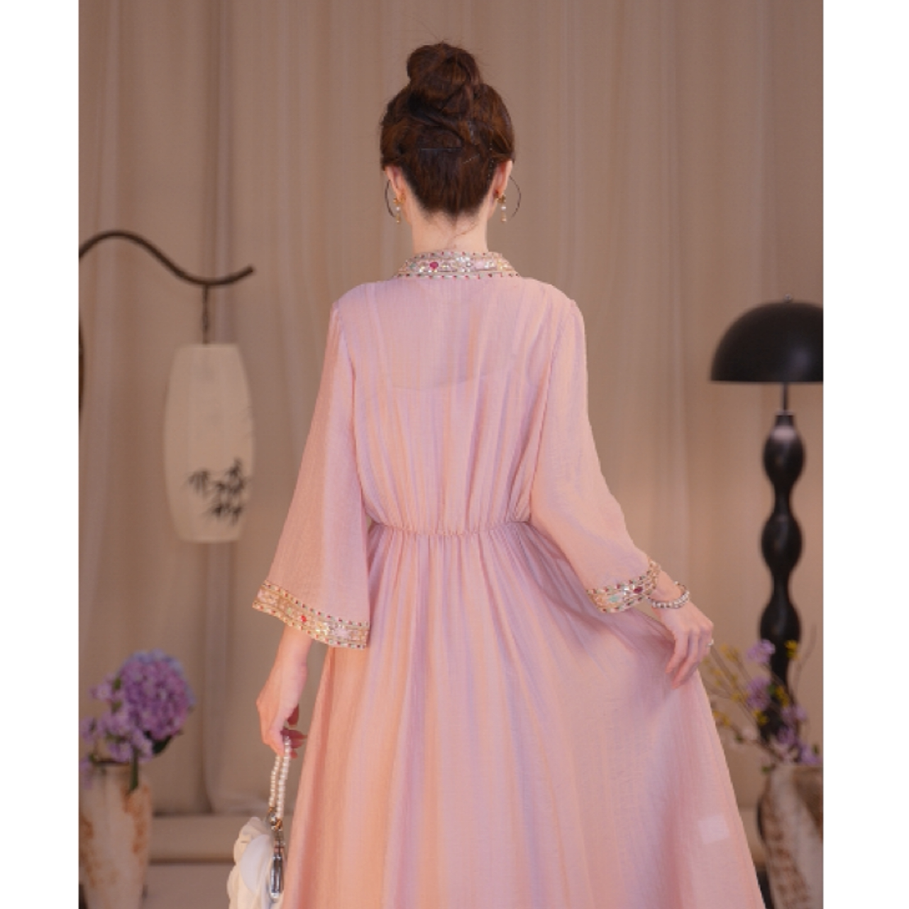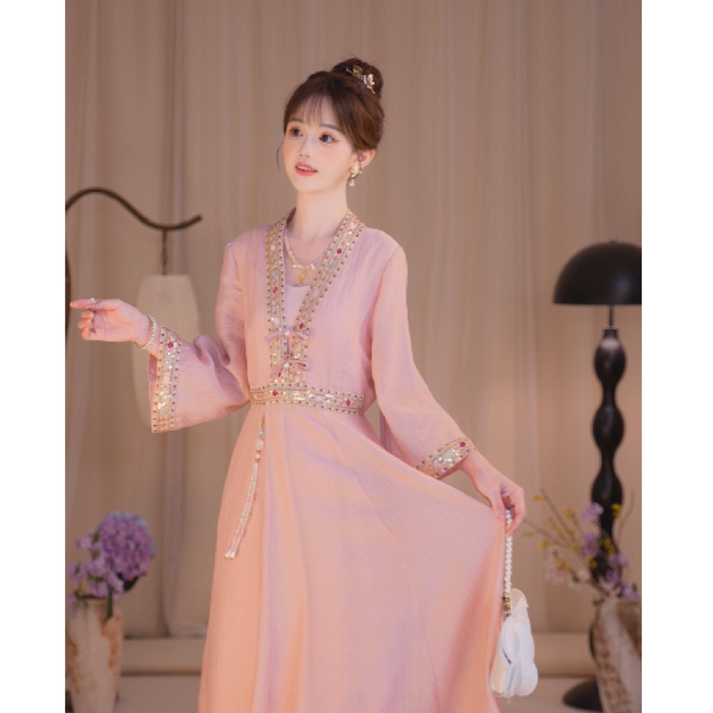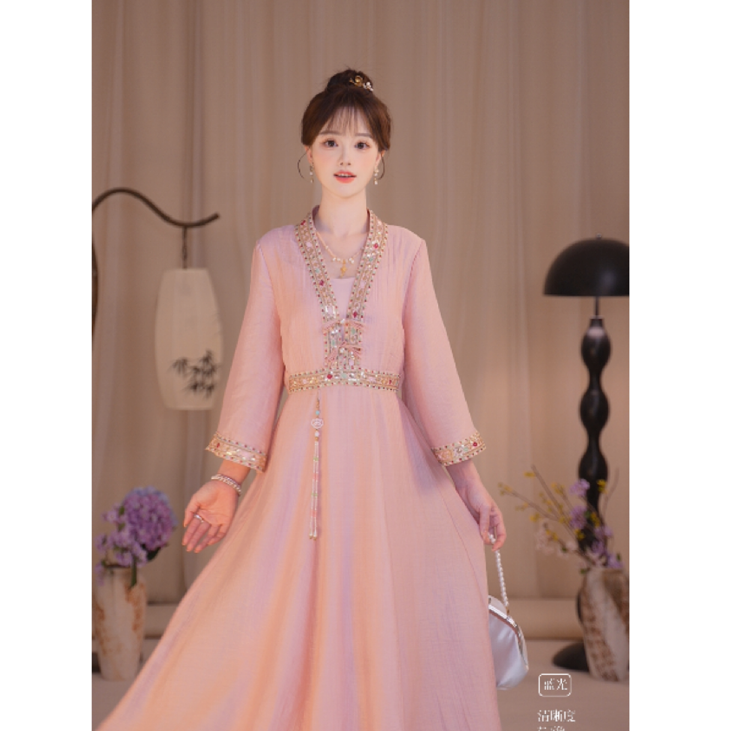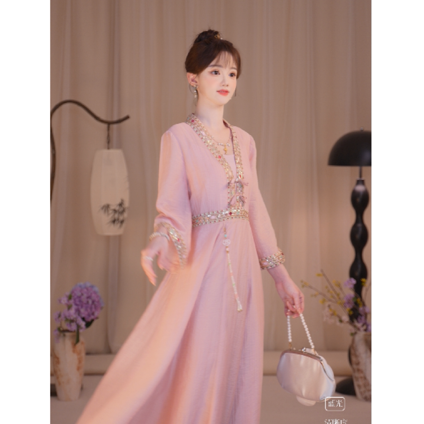 瑶西【粉香遥】中长裙V领秋季套头连衣裙汉服新中式长款两件套