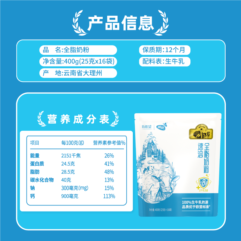 【100%生牛乳】新希望蝶泉大理邓川速溶全脂纯牛奶粉成人高钙奶粉