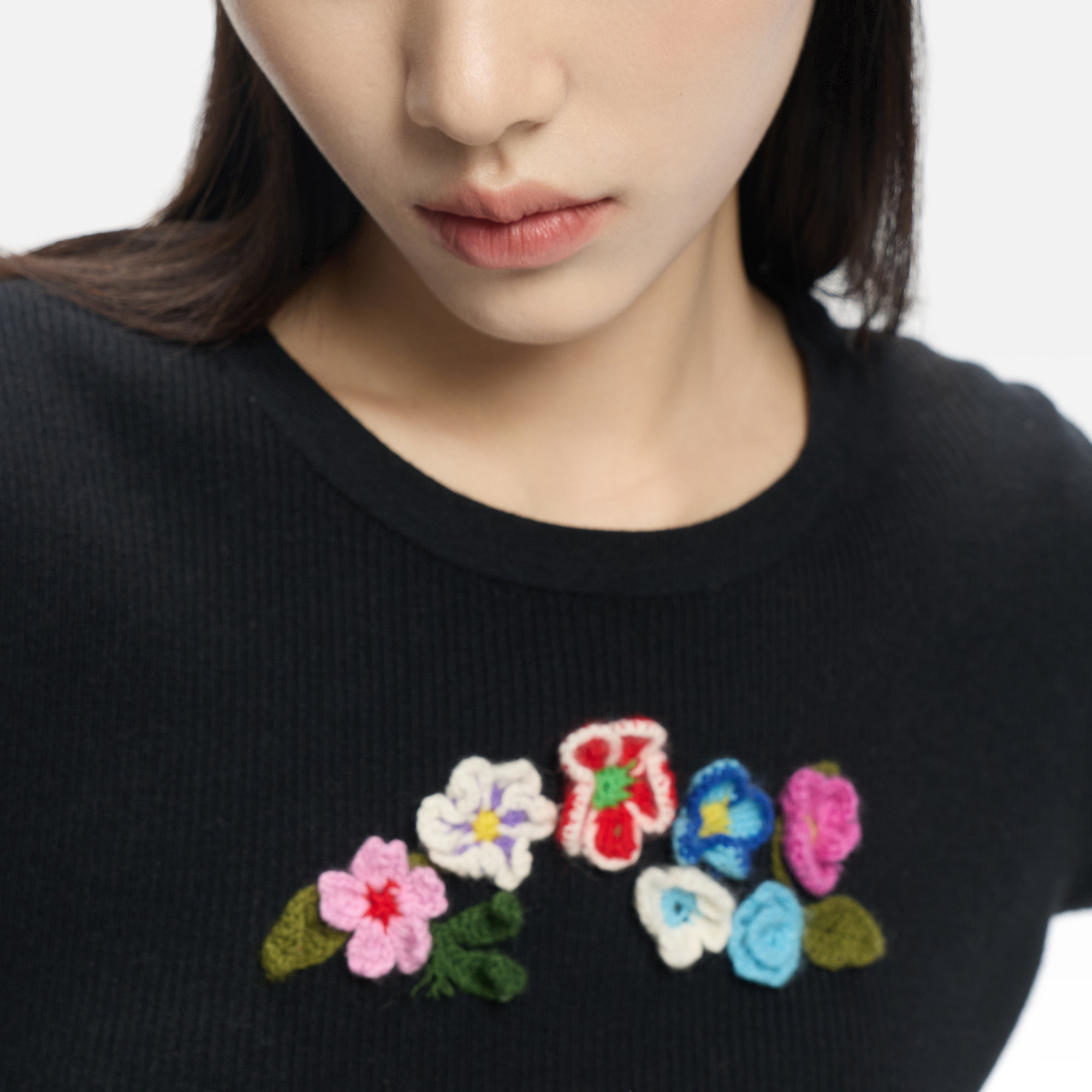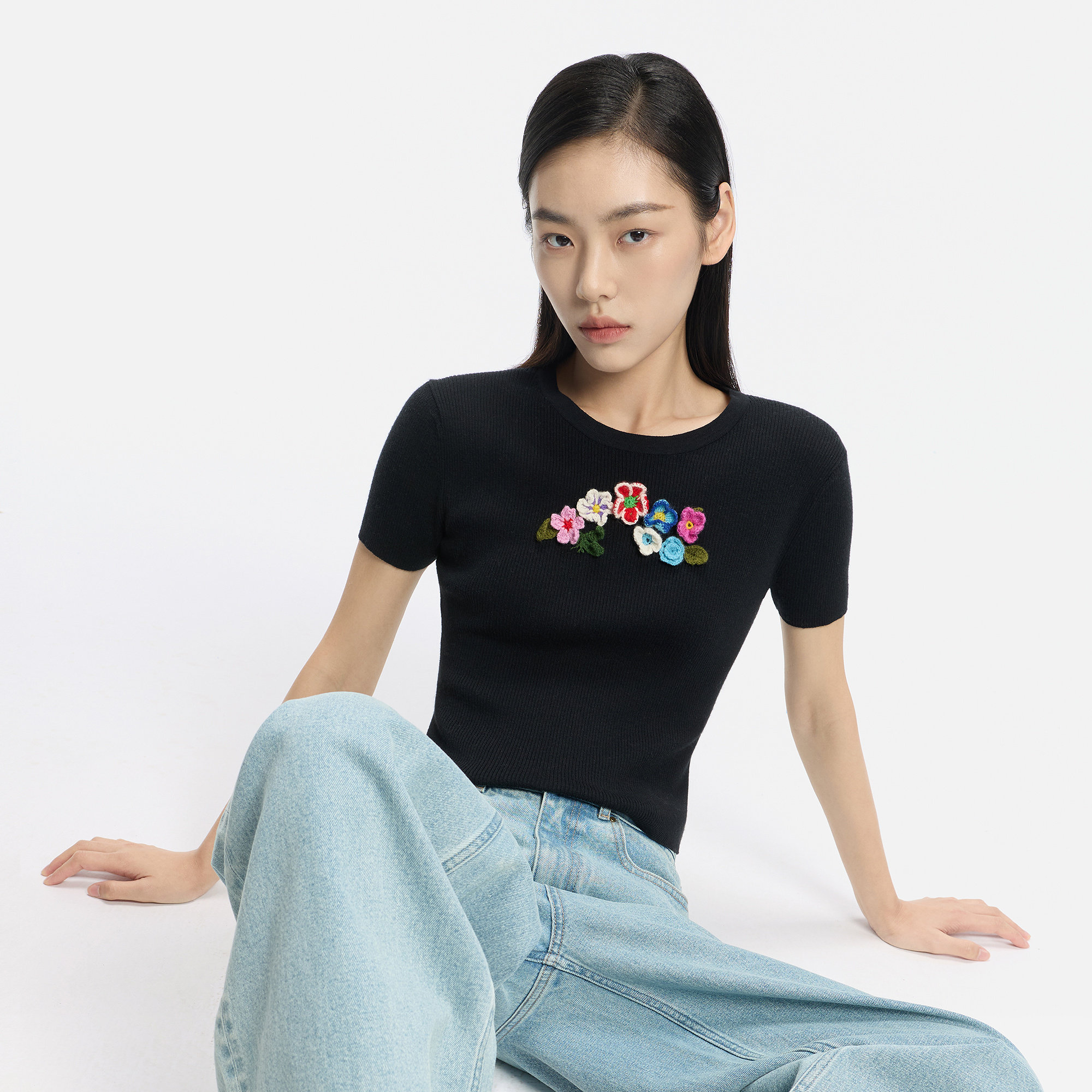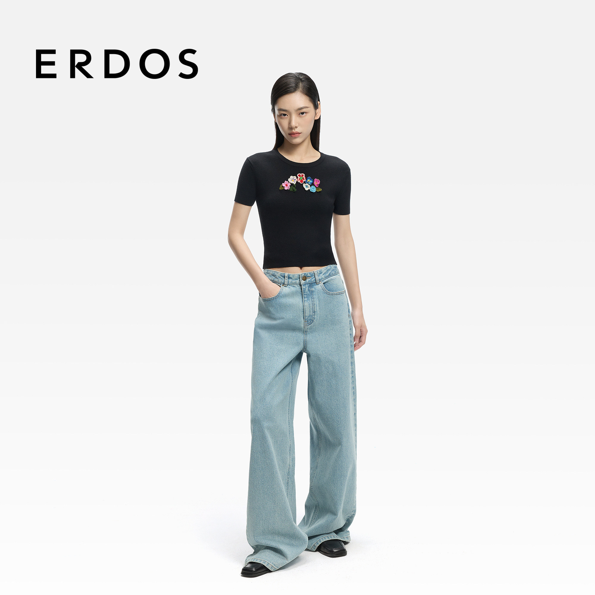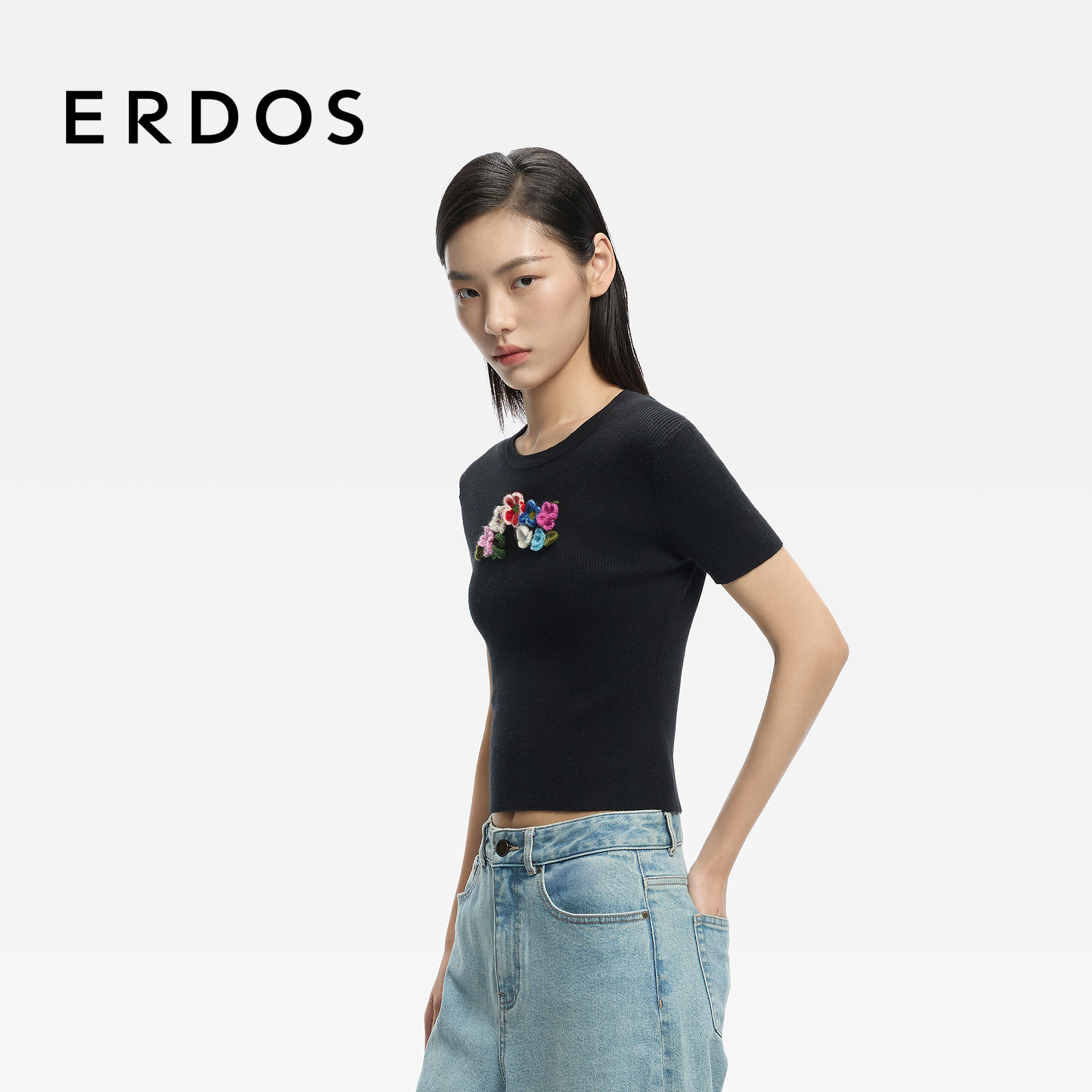 ERDOS 精纺圆领半袖女士套衫26年春新品手钩花朵装饰修身半袖T恤