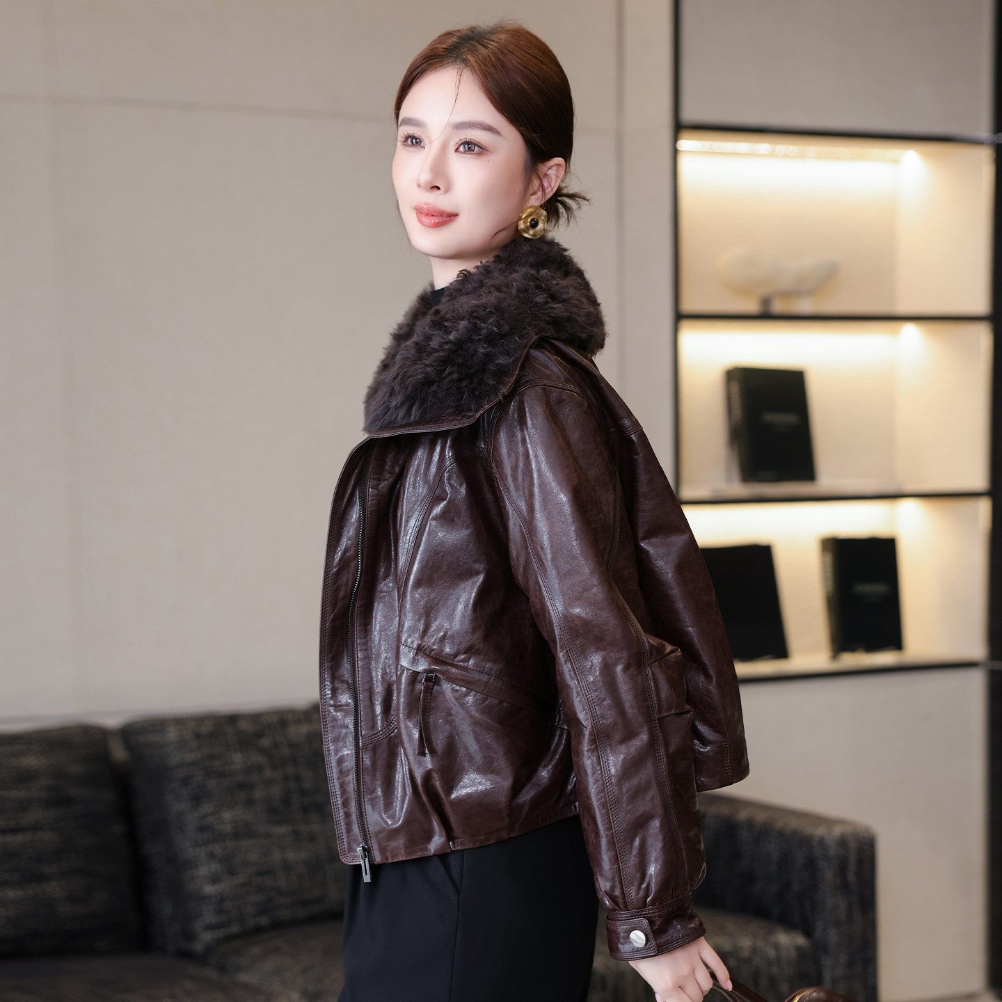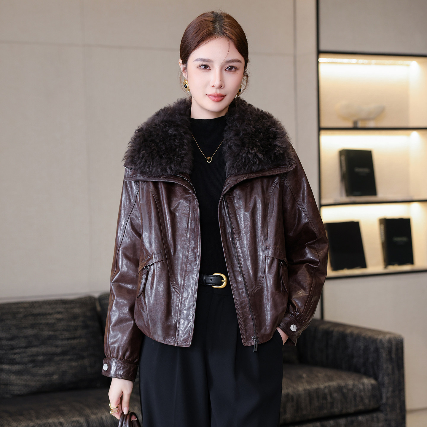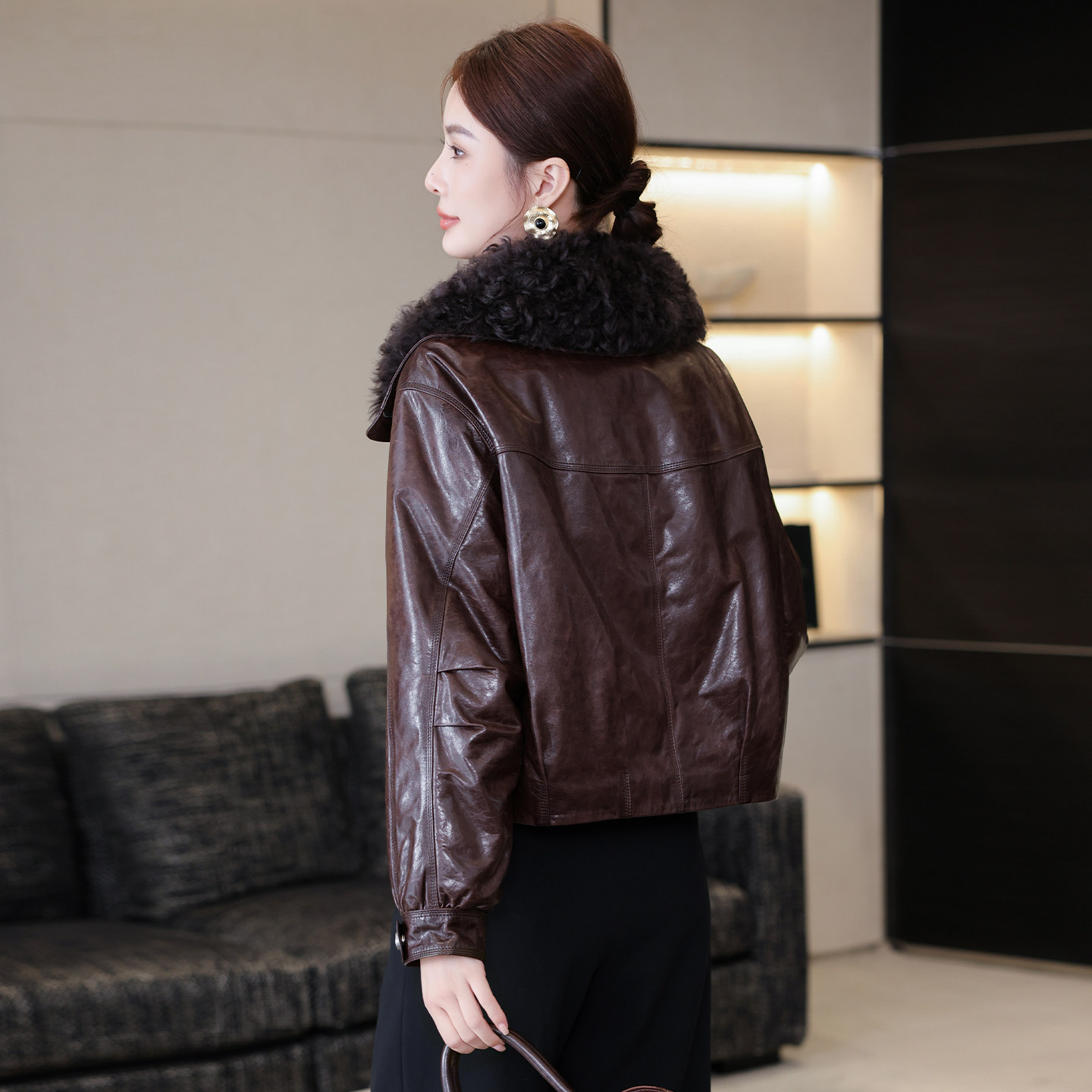 海宁油蜡真皮羽绒服女短款绵羊皮