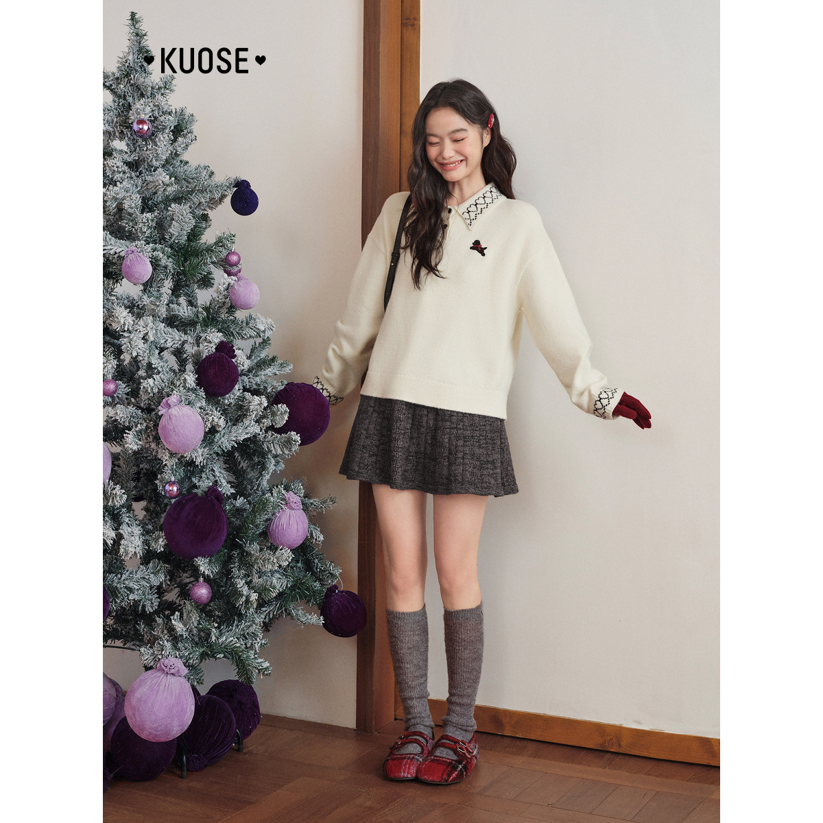 杏色polo领刺绣毛衣女气质软糯