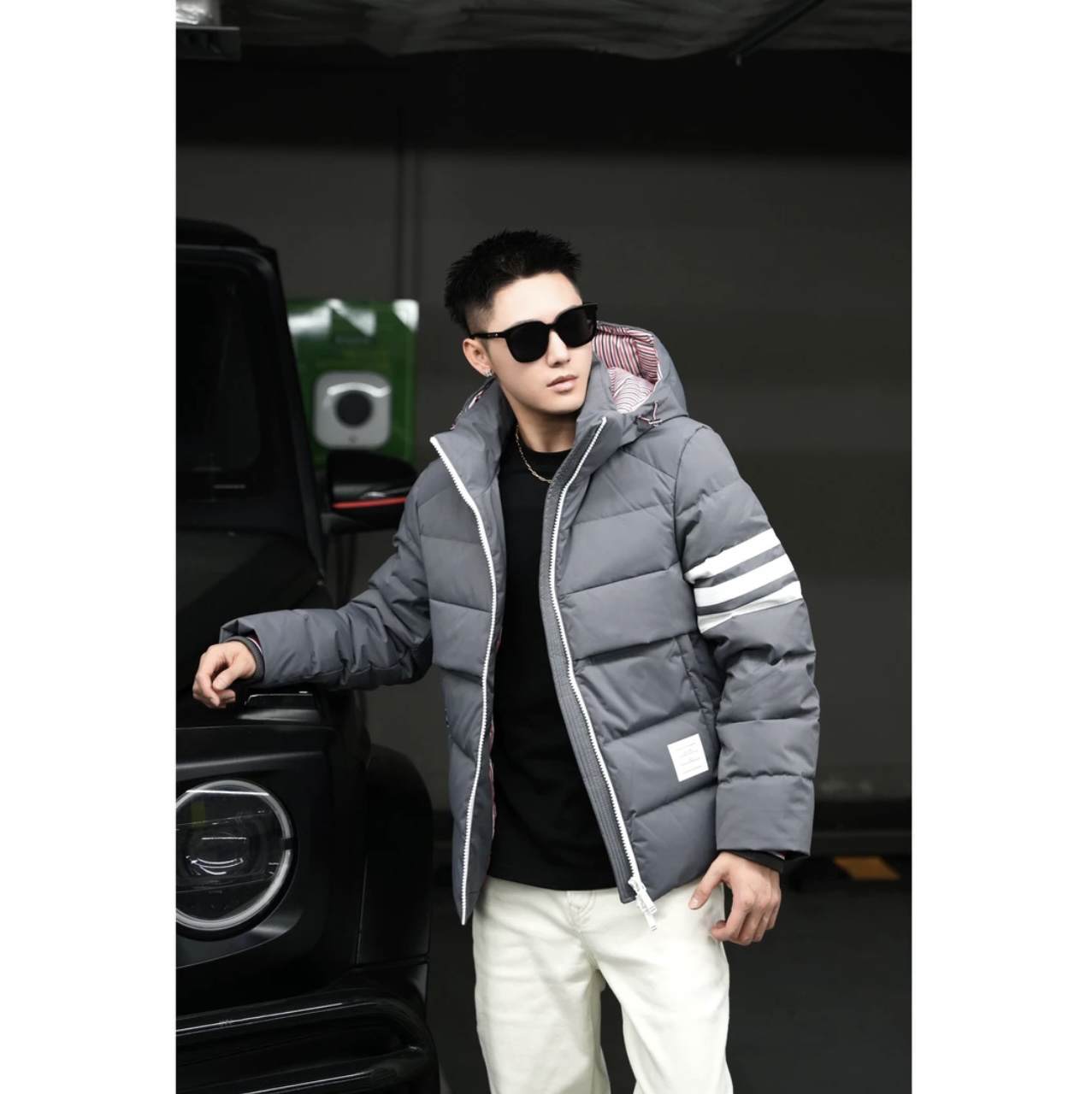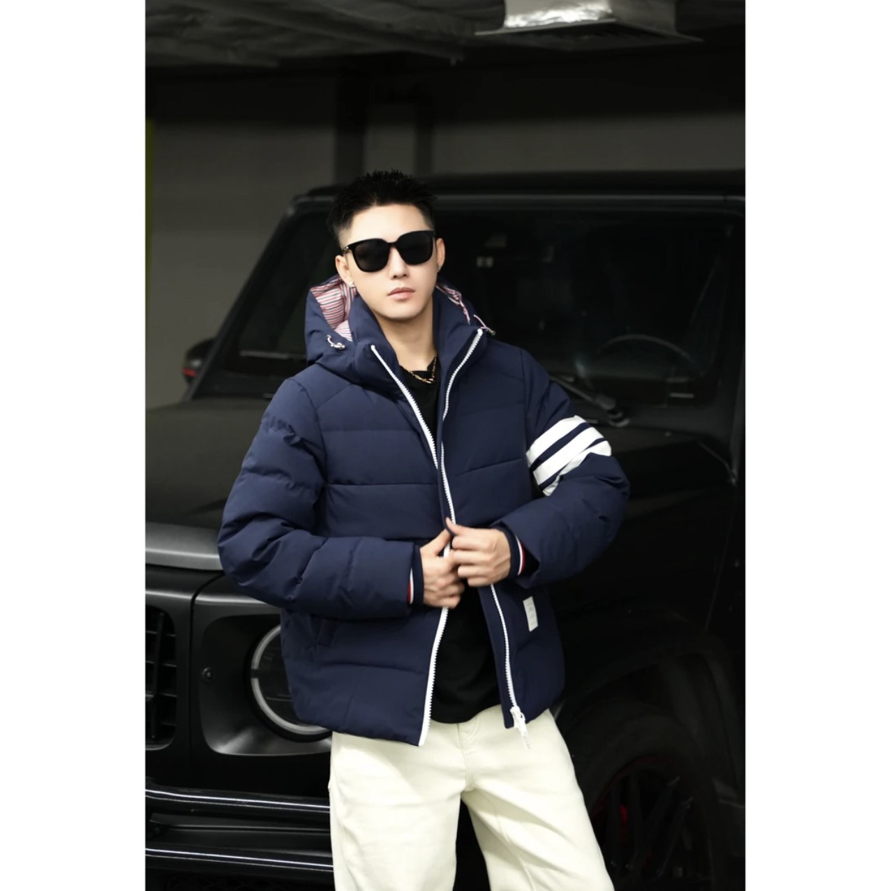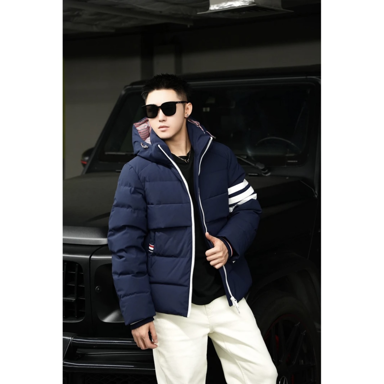 【彩条背带】90白鸭绒加厚三杠可拆卸连帽羽绒服夹克外套男士保暖