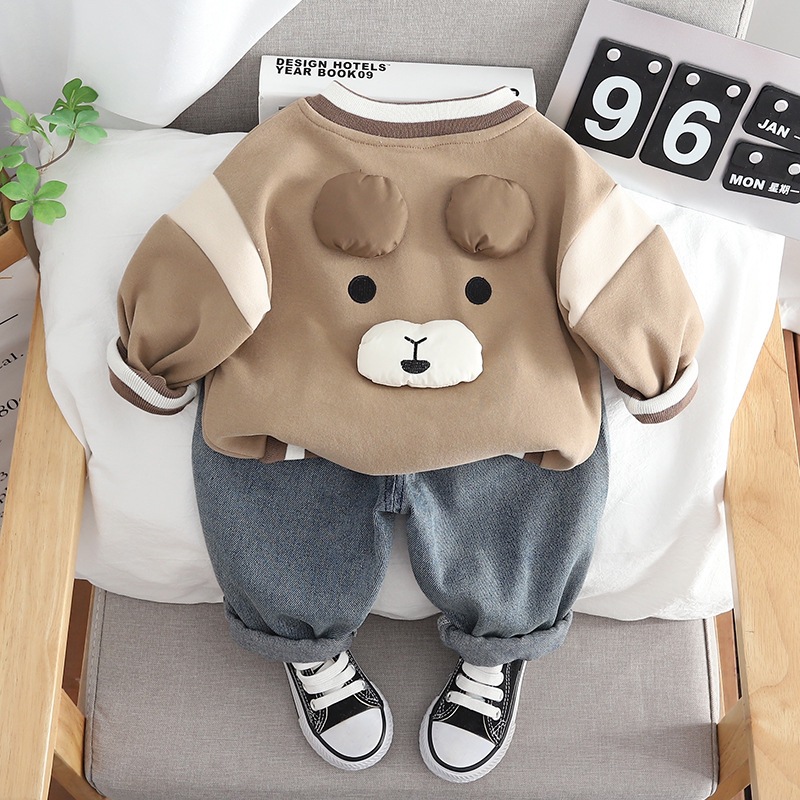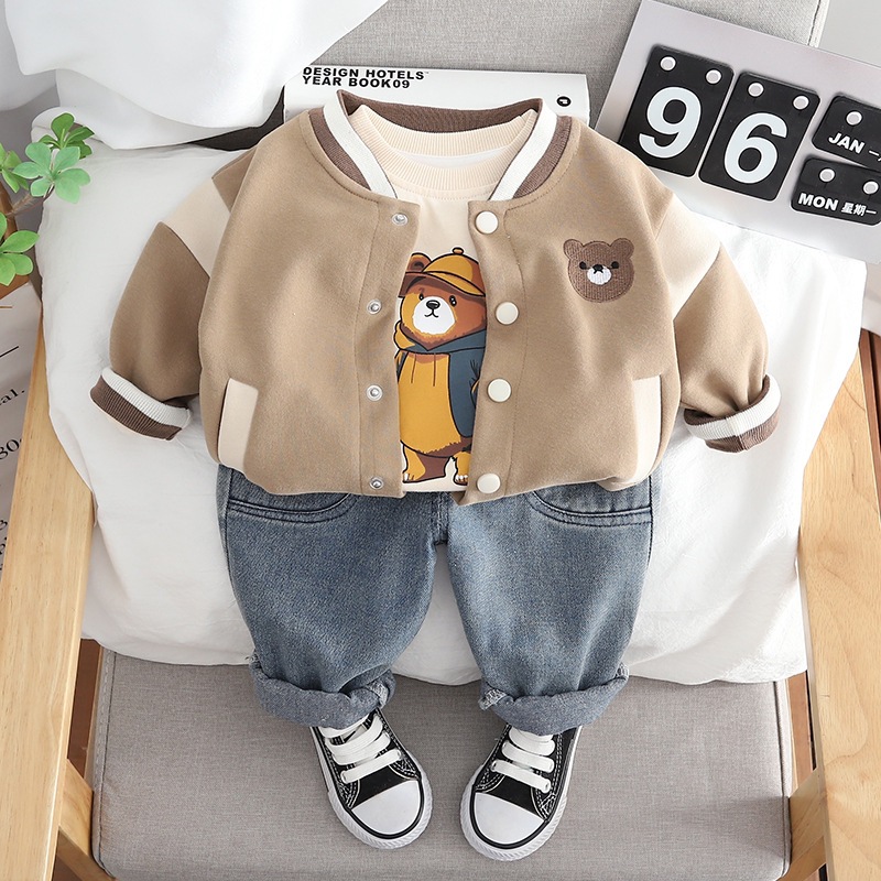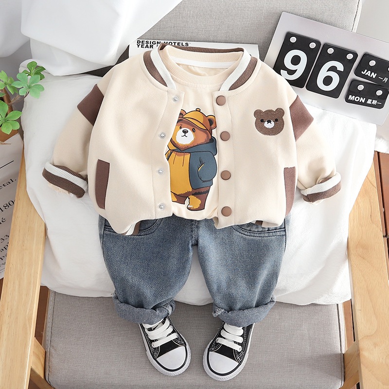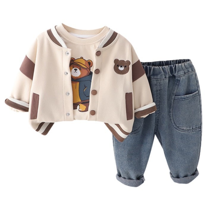 秋季新款男童卡通棒球服长袖三件套男宝宝休闲牛仔长裤套装潮