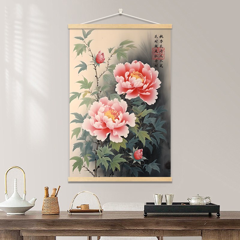 牡丹花玄关挂画卧室书房中国风装饰画客厅餐厅背景墙壁画实木卷轴