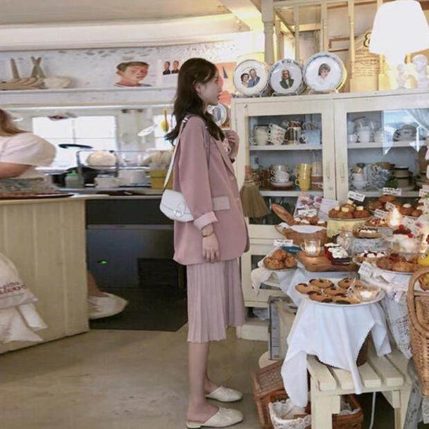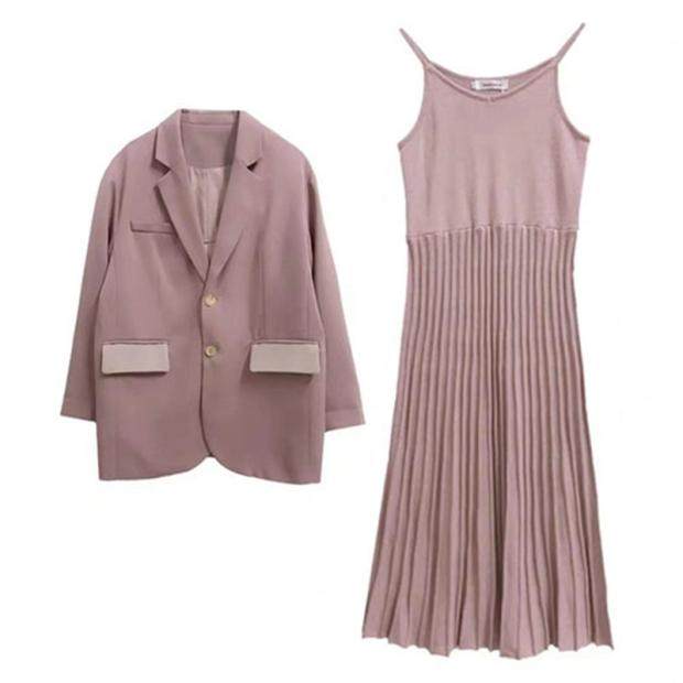 大码两件套西装连衣裙套装西服胖人妹妹秋冬洋气网红百褶吊带裙子