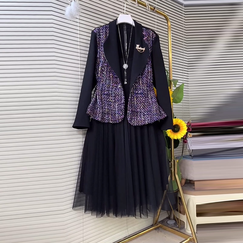 胖妹妹翻领长袖外套网纱裙摆连衣裙大码女装气质轻熟风显瘦两件套