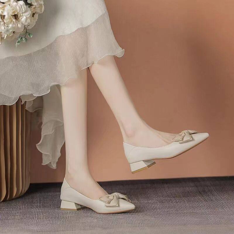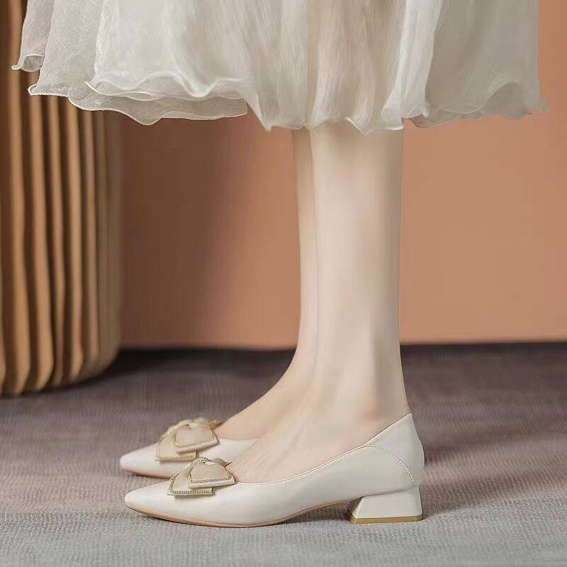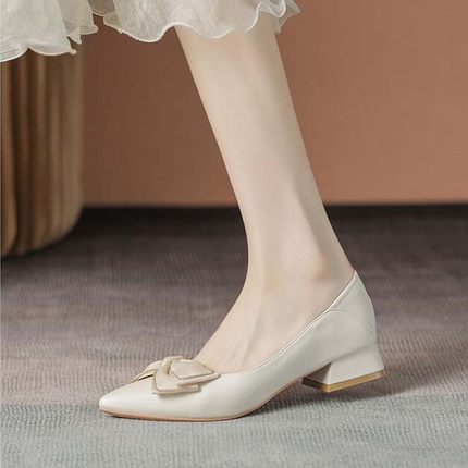 粗跟尖头单鞋女2023年新款不累脚时尚中跟浅口黑色工作鞋通勤女鞋