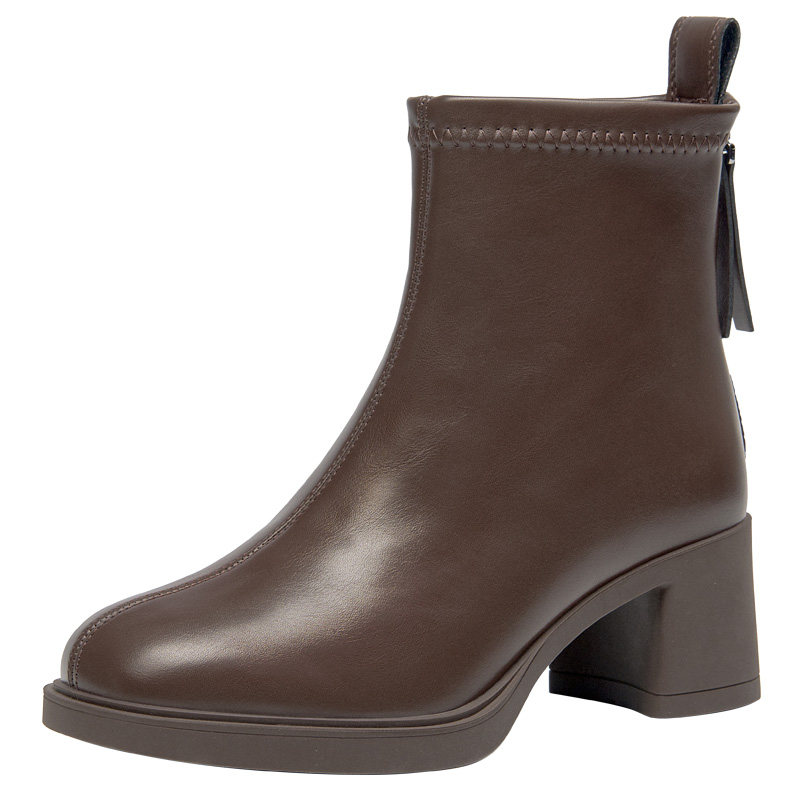 大东官方高跟短靴女2025新款冬季棕色女靴高跟鞋粗跟瘦瘦靴小裸靴