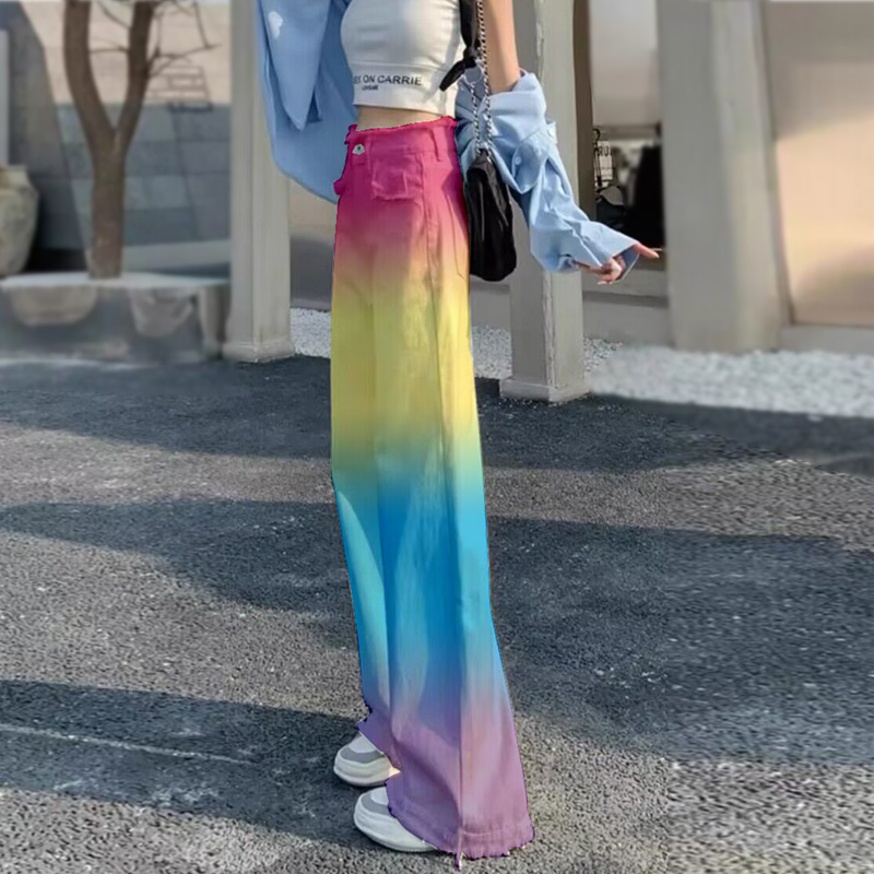 原创扎染多巴胺彩虹破洞牛仔裤女春夏季高腰直筒垂感阔腿长裤女裤