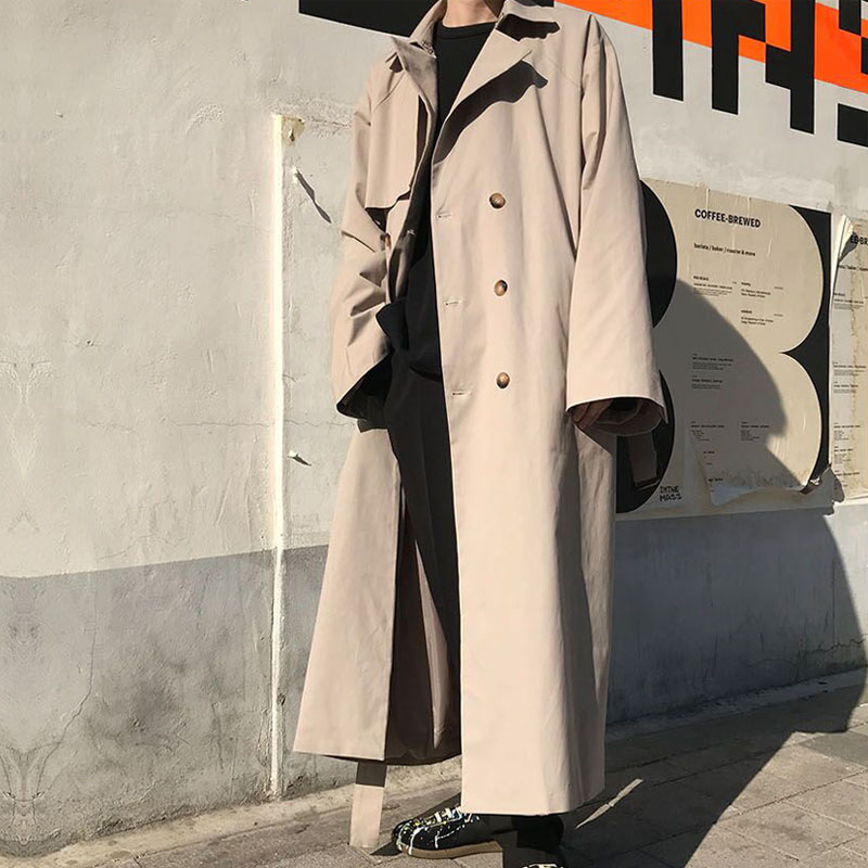 地界二青年男士过膝英伦风男春季风衣长款系带双排扣韩版宽松落肩