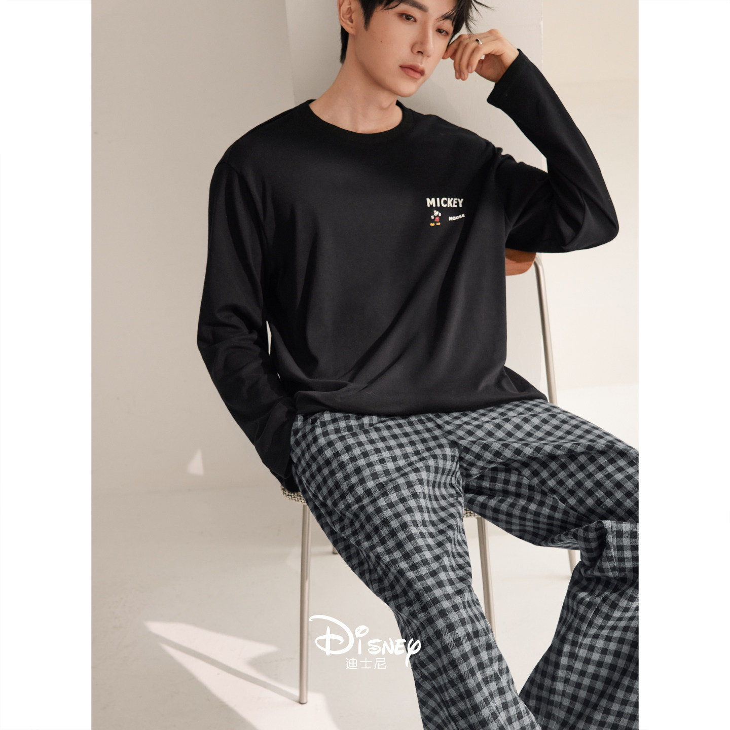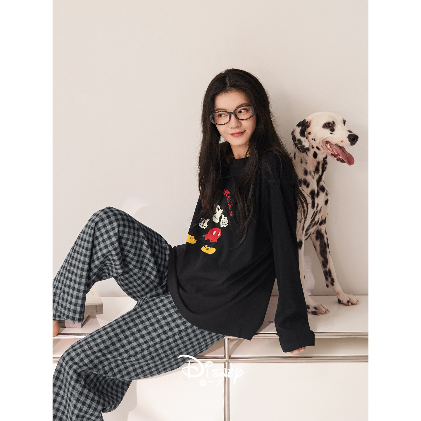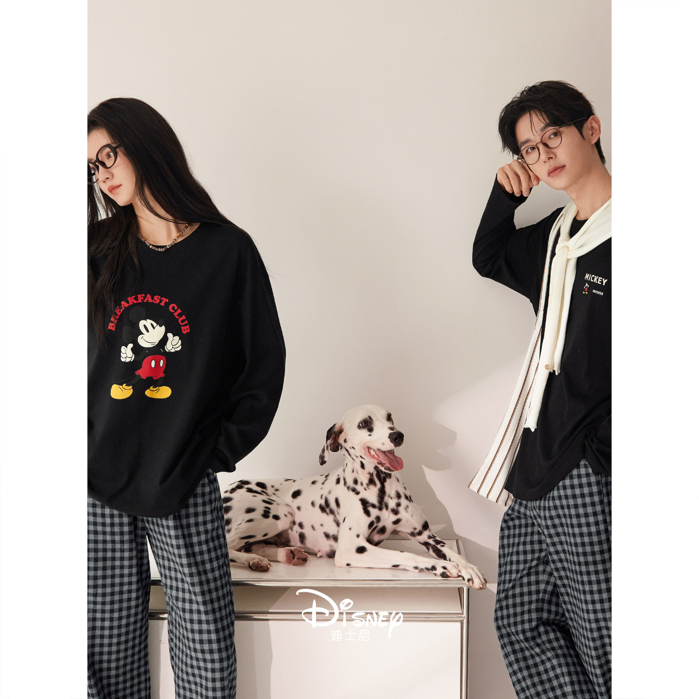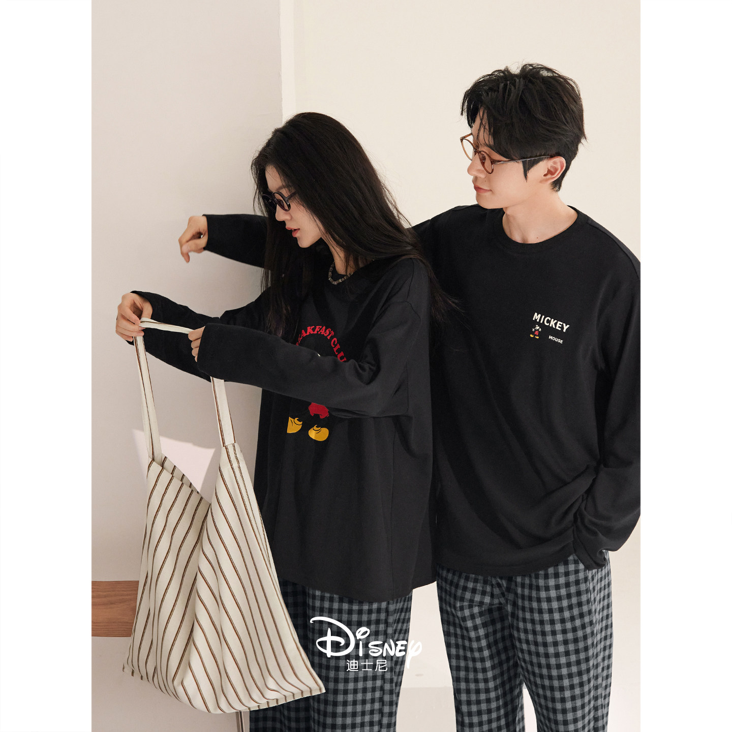 迪士尼情侣睡衣女春秋季柔软棉长袖米奇家居服可外穿男士大码套装