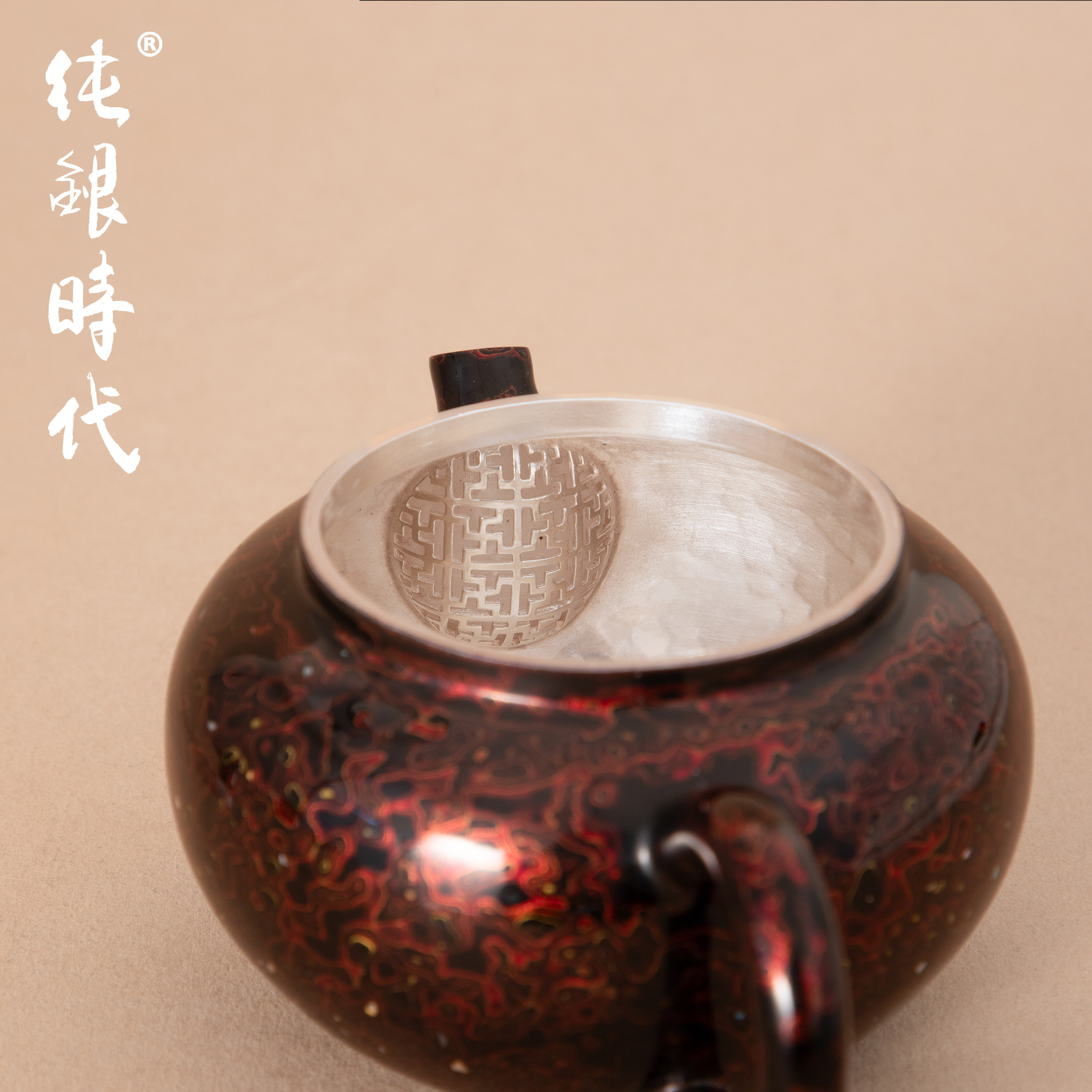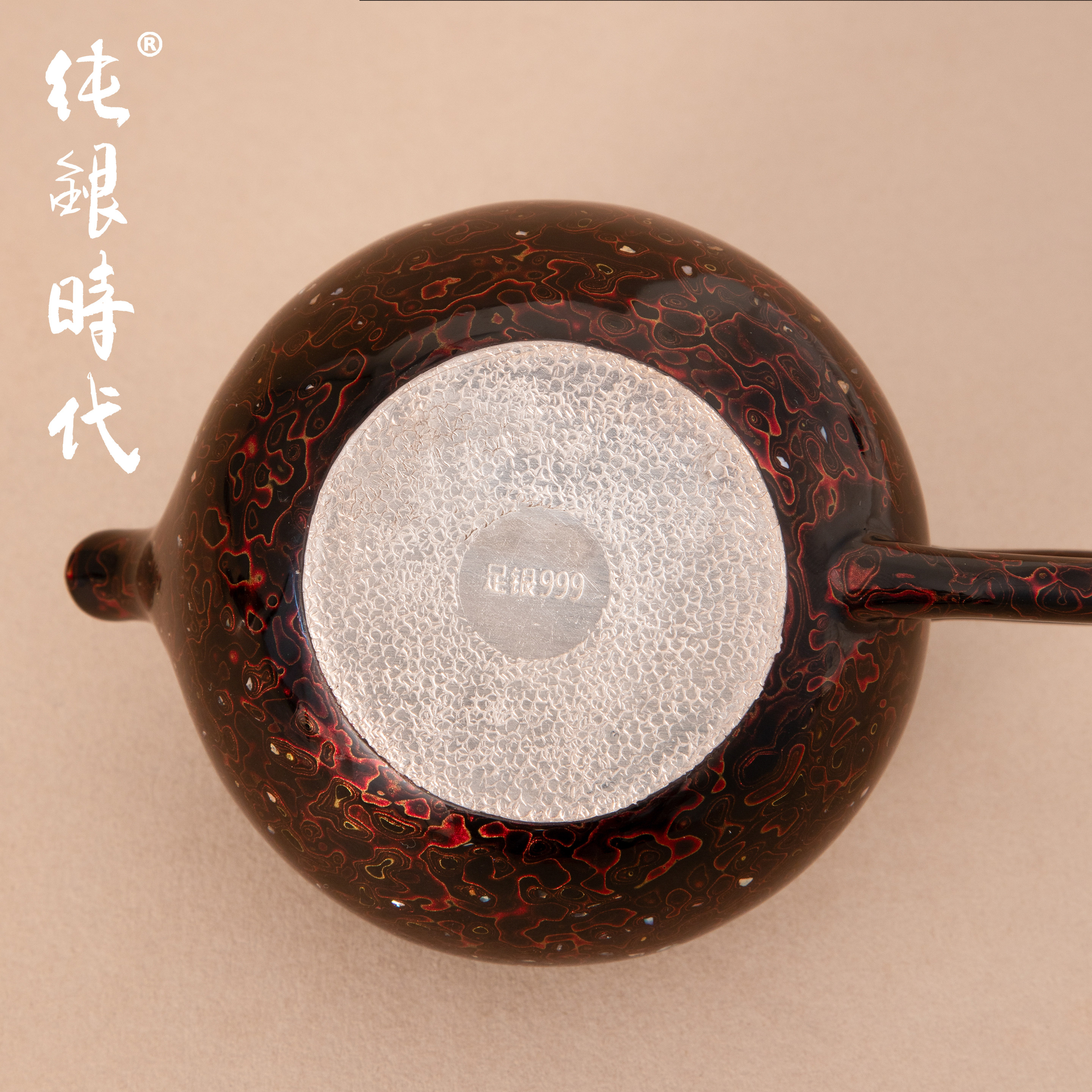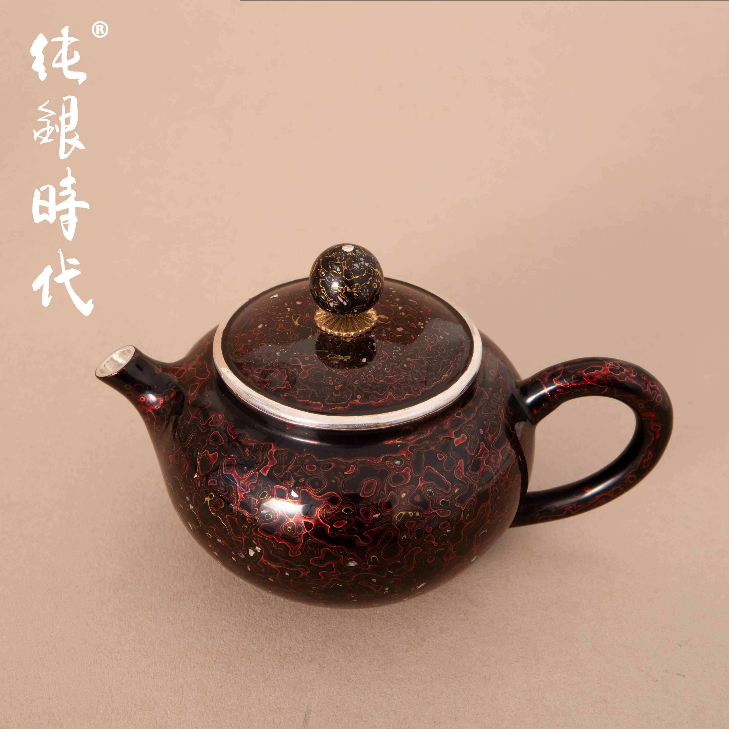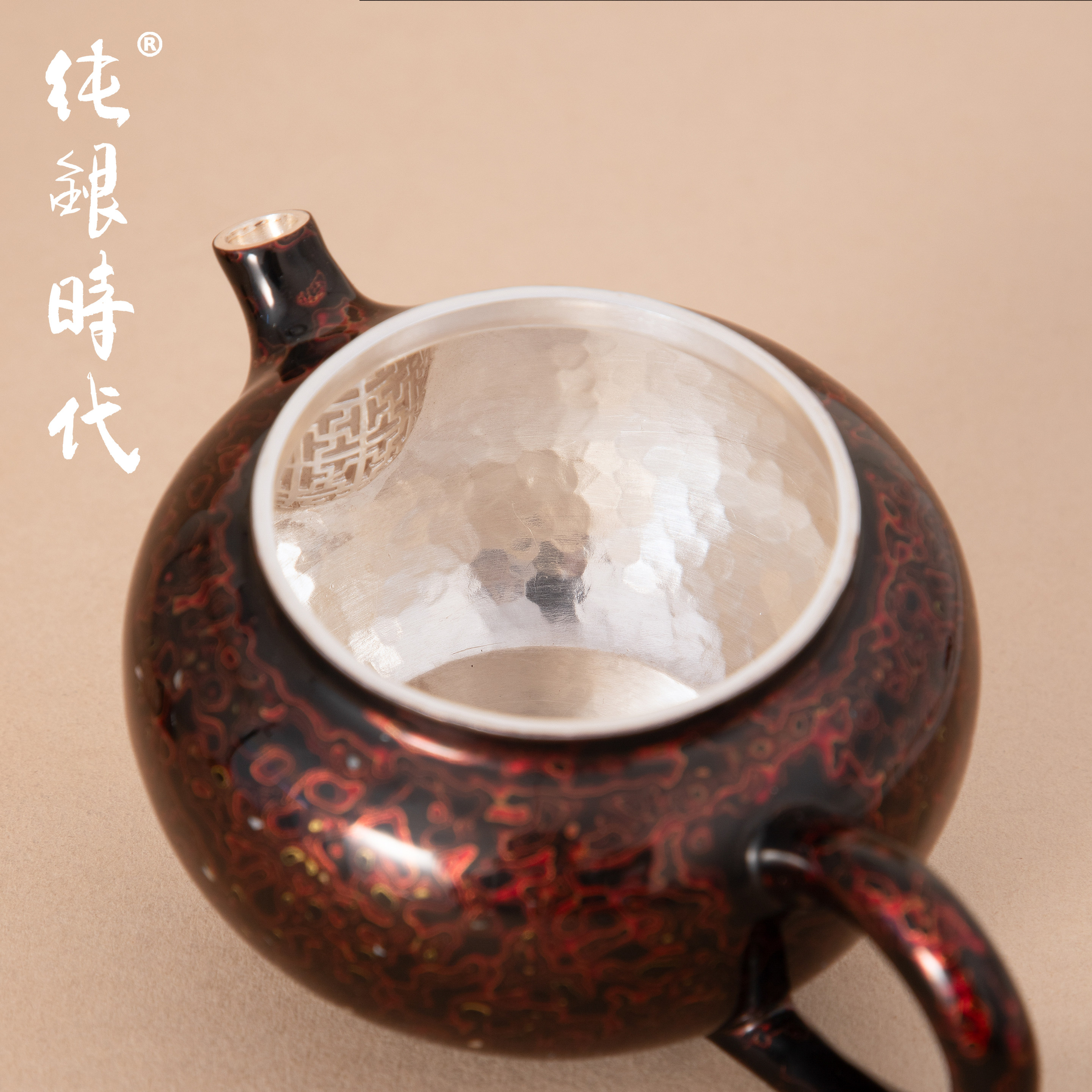 纯银时代墨焰泡茶壶手工漆器一张打纯银999功夫茶具高端银壶170ml