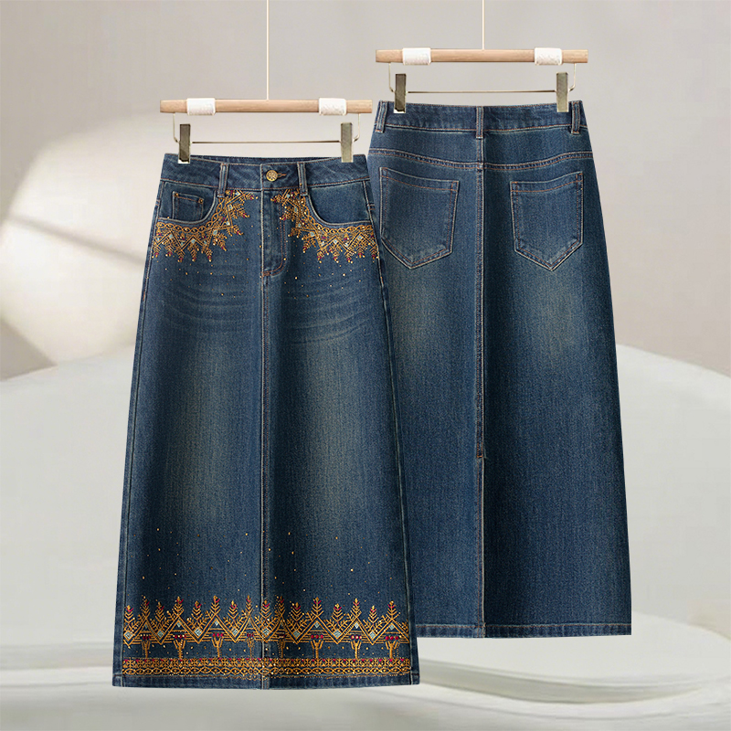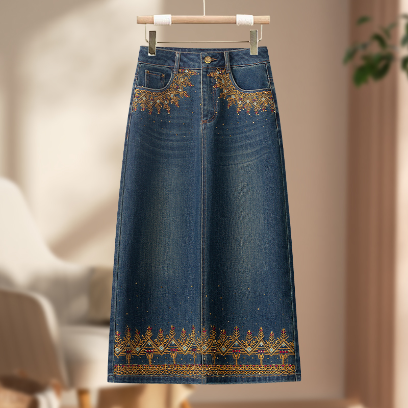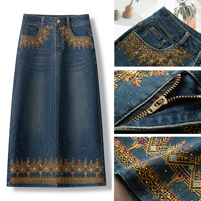 高端烫钻牛仔半身裙女2025新款秋季高腰刺绣民族风气质时尚长裙