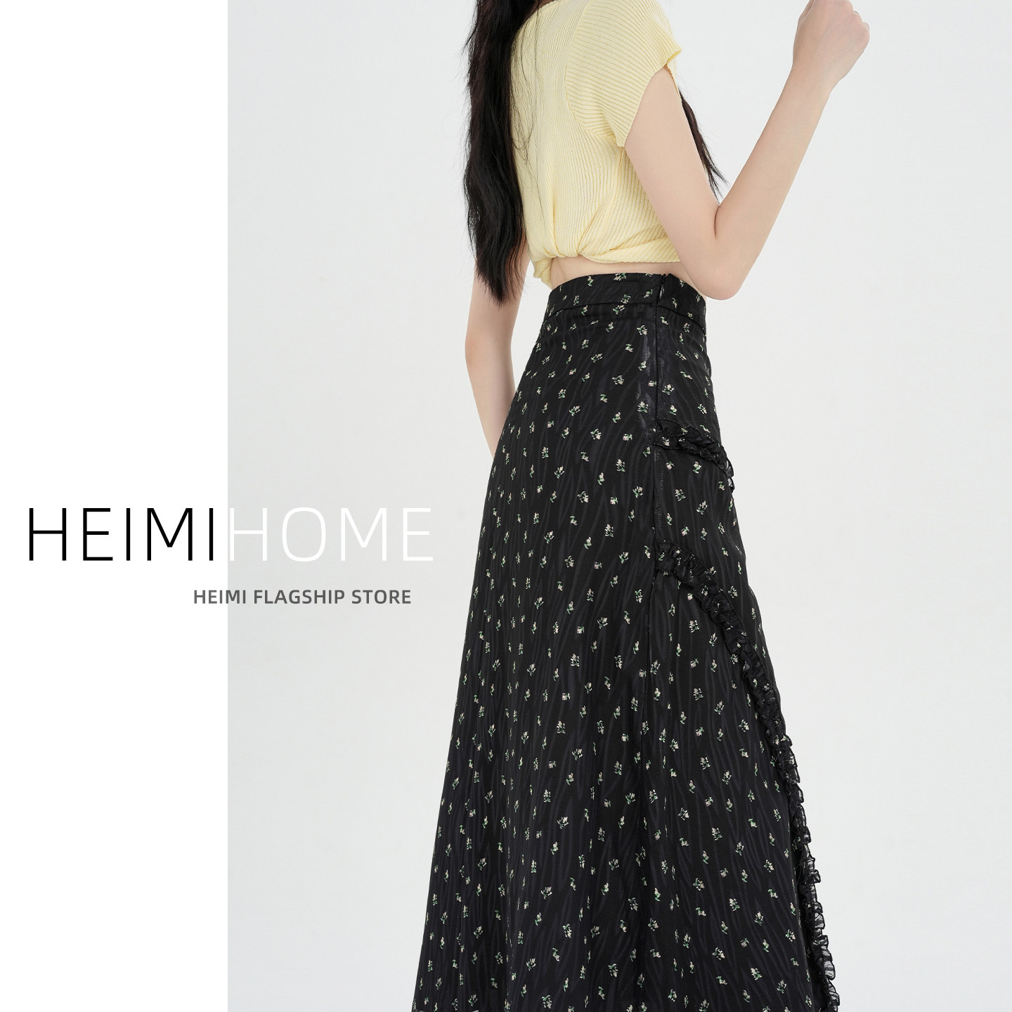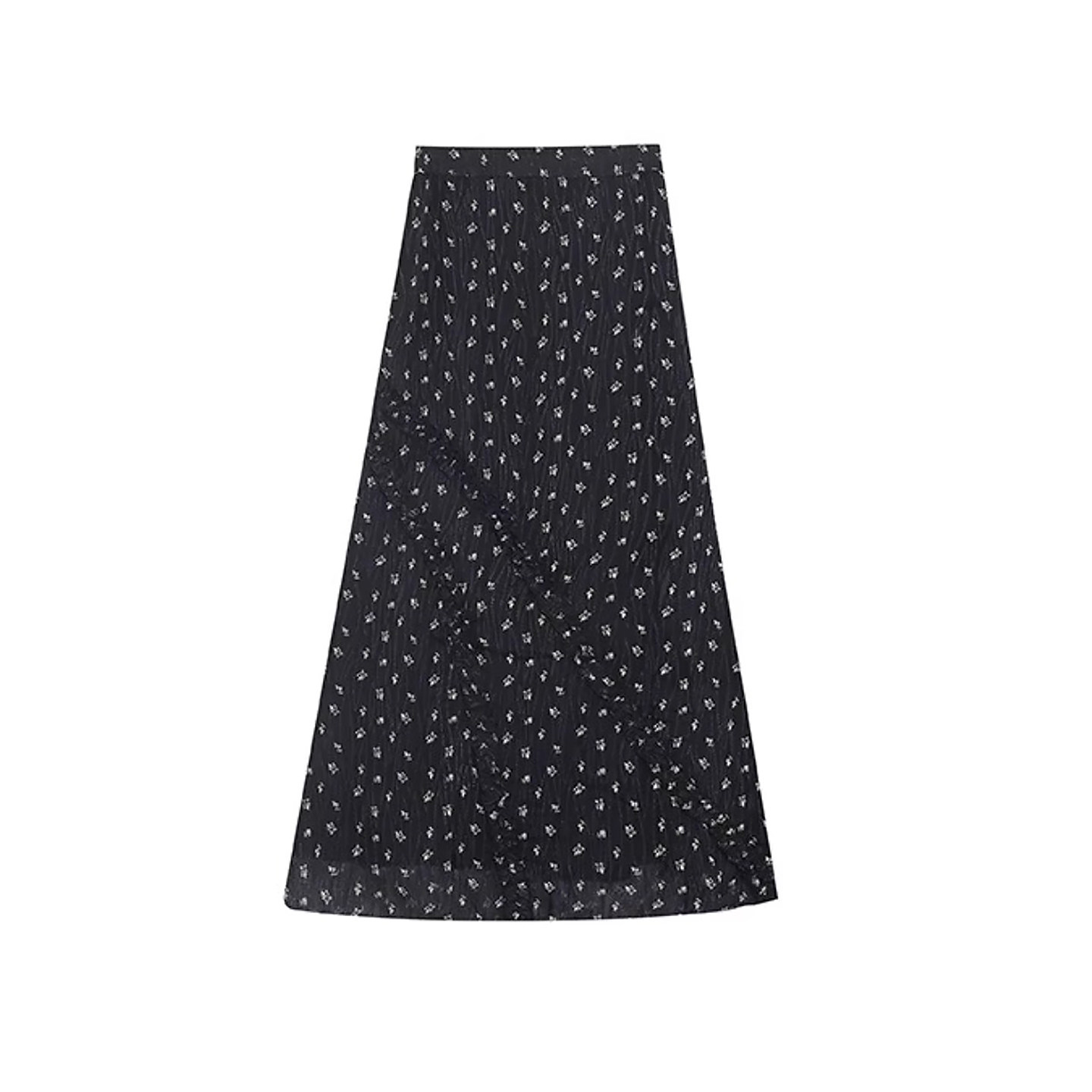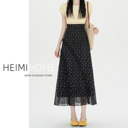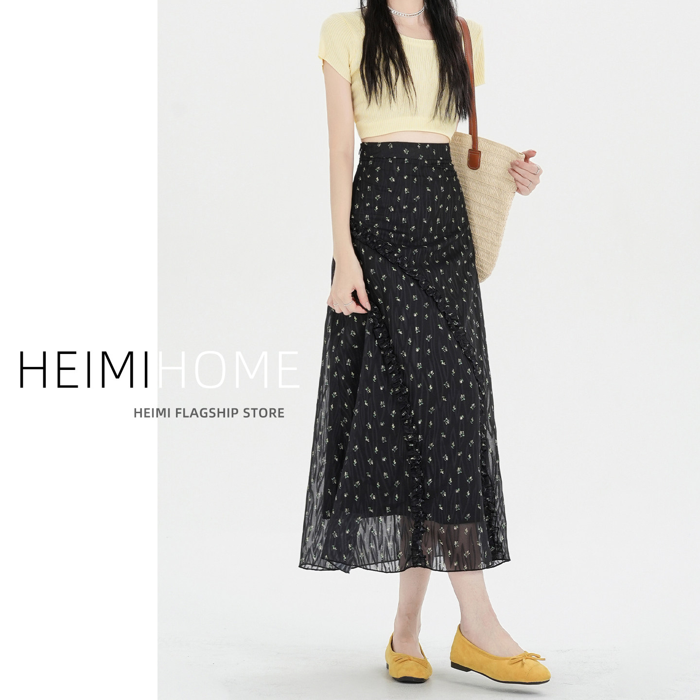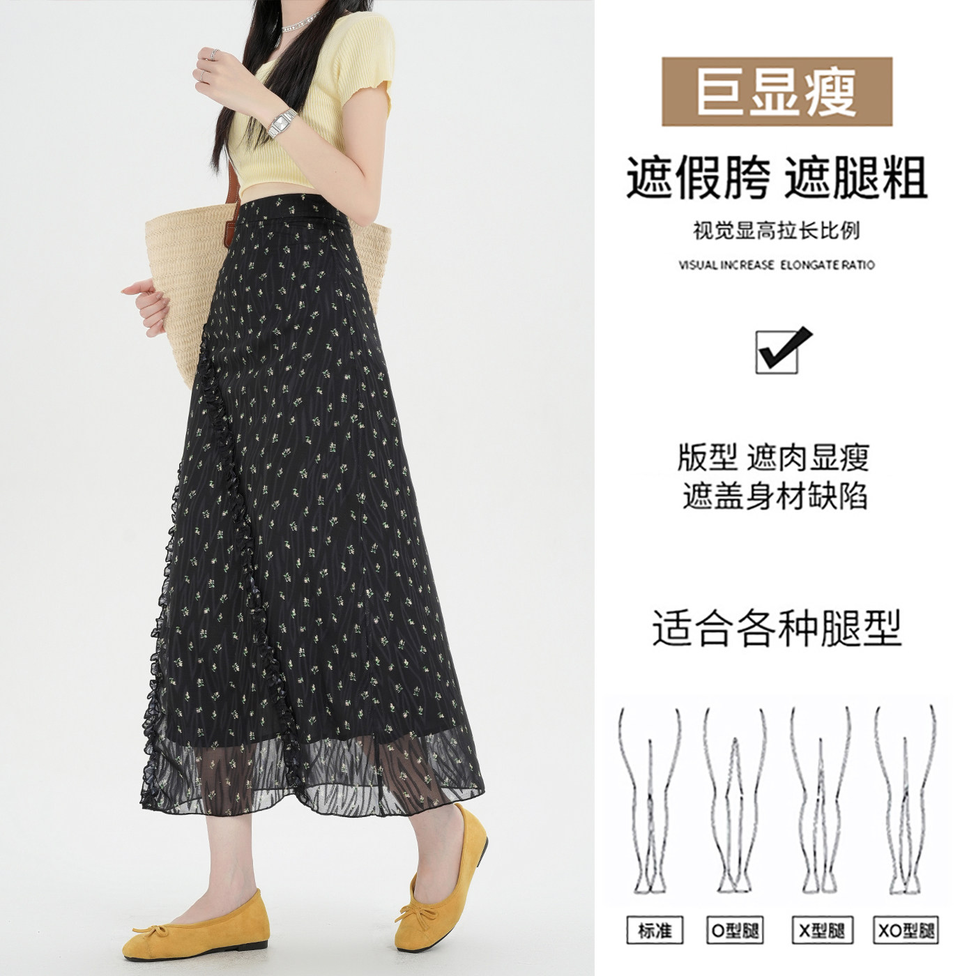 法式黑色碎花半身裙女夏季薄款雪纺中长裙设计感木耳花边A字裙子