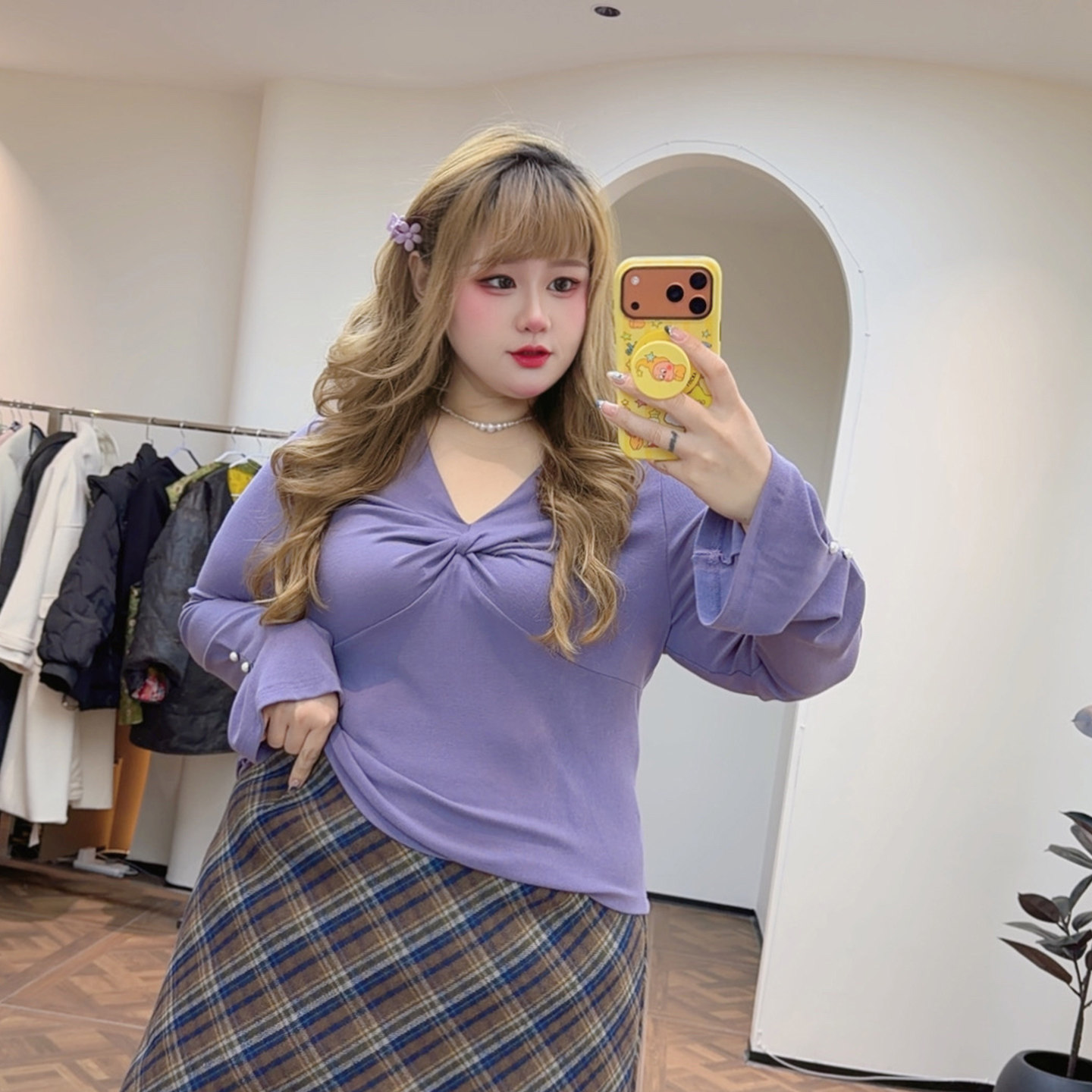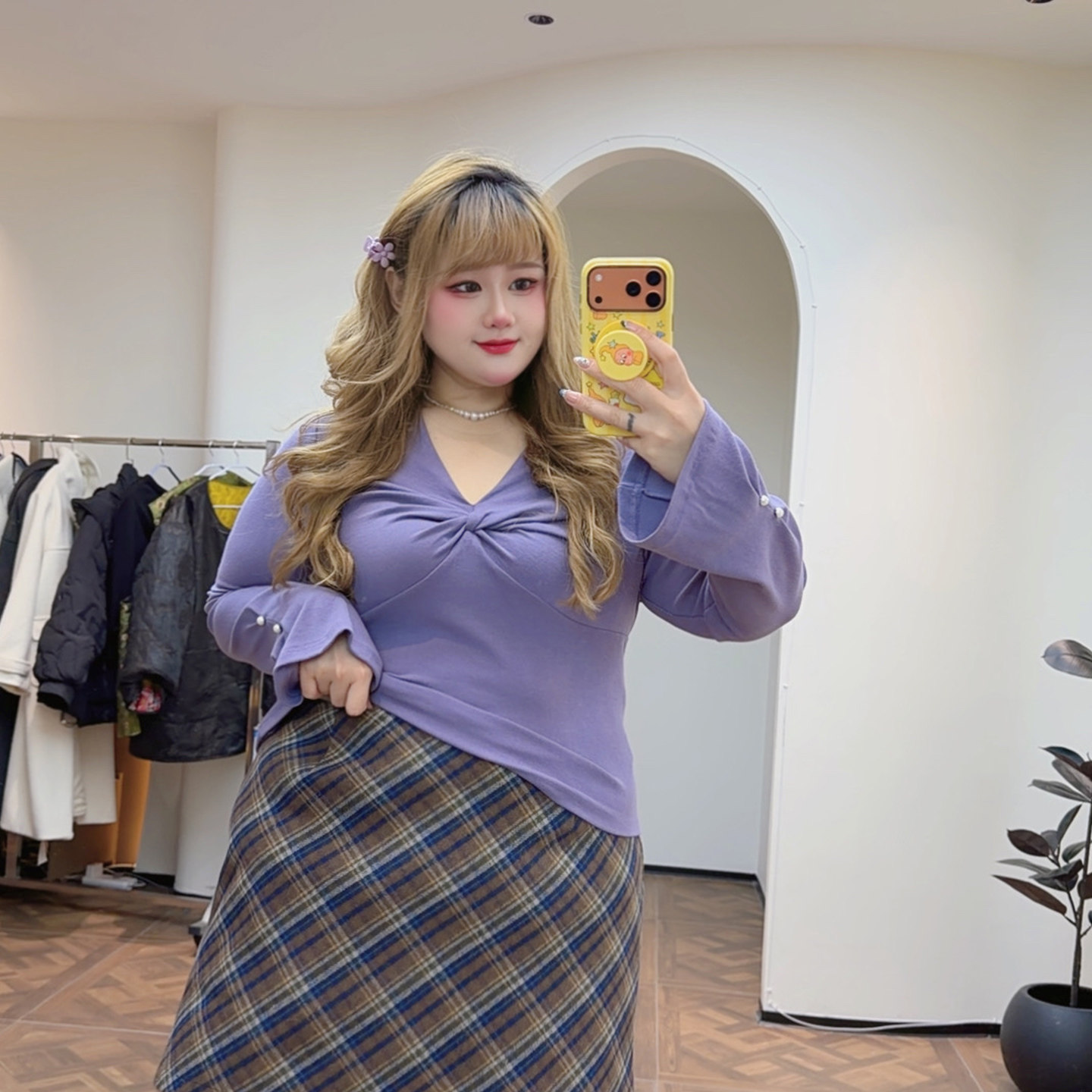 胖莹大码女装胖mm韩系少女感减龄格纹松紧腰A字版显瘦毛呢半身裙