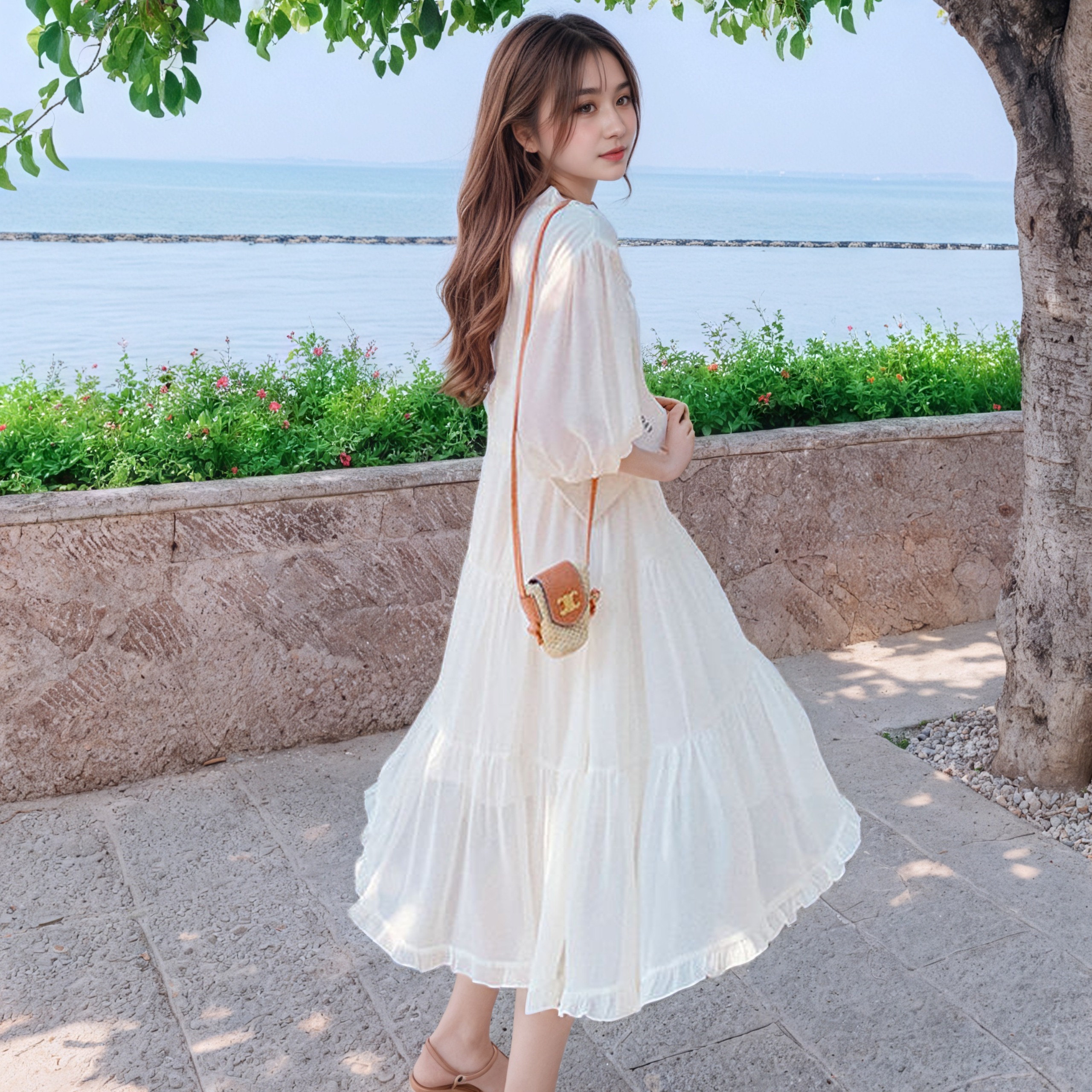 夏新款白月光连衣裙女法式木耳边雪纺系带收腰显瘦甜美初恋小白裙