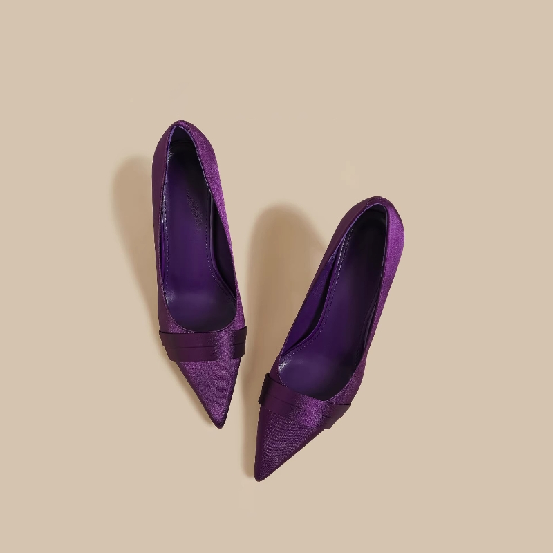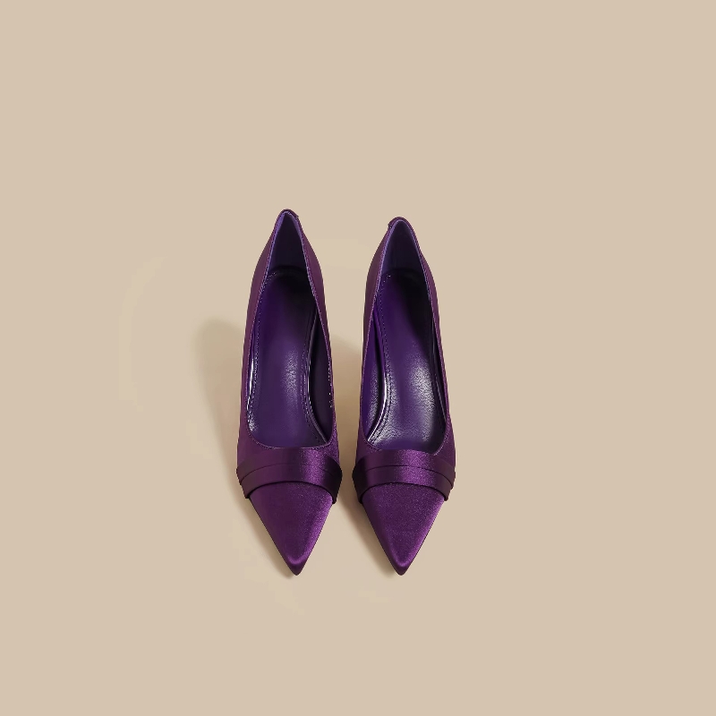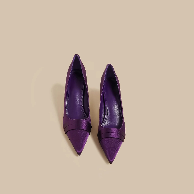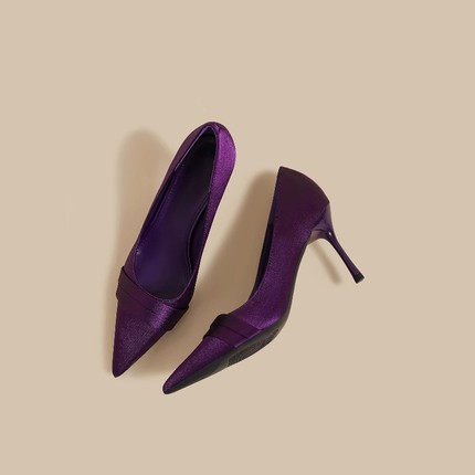 2025秋季新款法式浅口单鞋女紫色细跟玛丽珍鞋尖头绸缎绝美高跟鞋