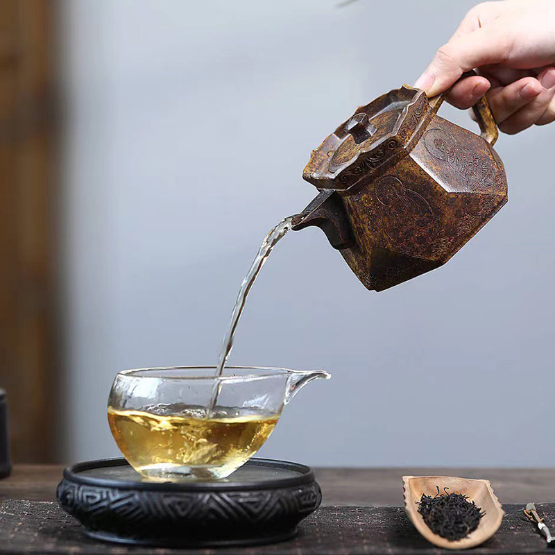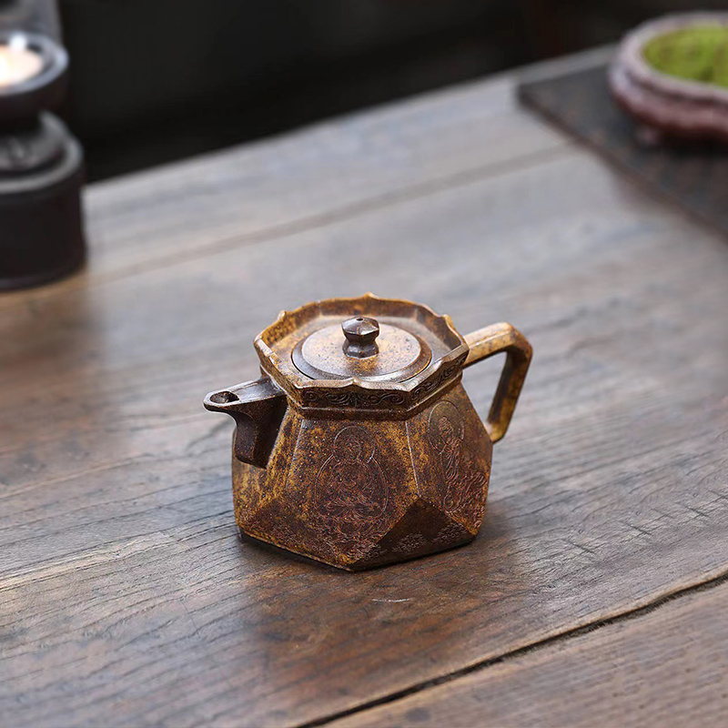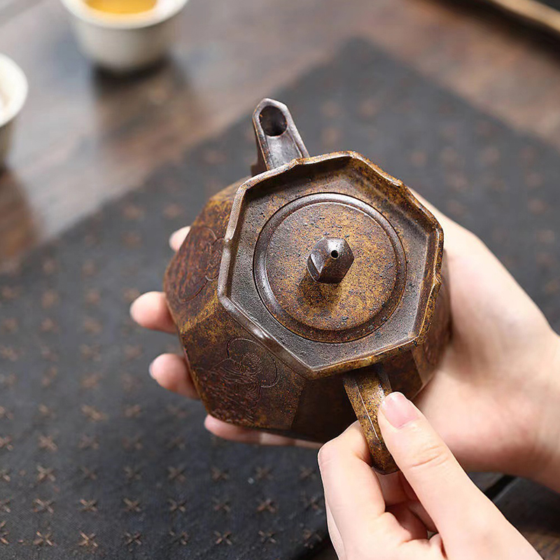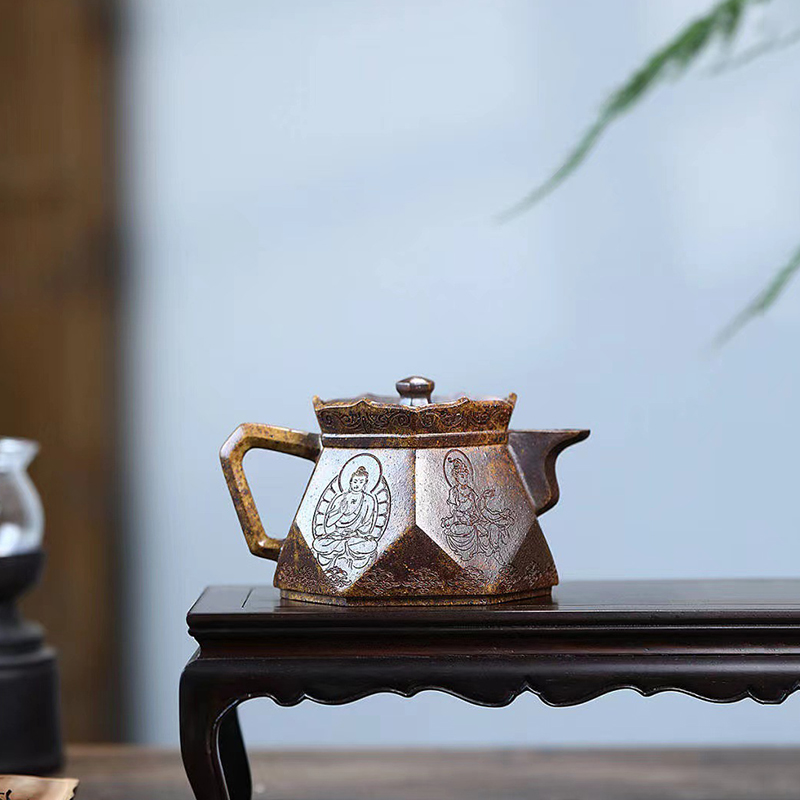 宜兴紫砂壶原矿段泥柴烧钻石僧帽壶手工刻绘中式礼品泡茶器 310ml