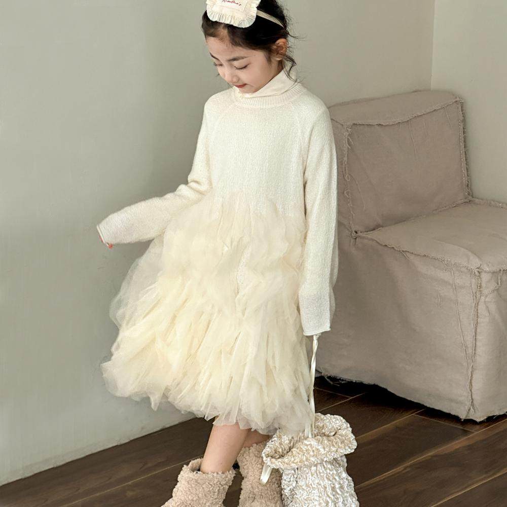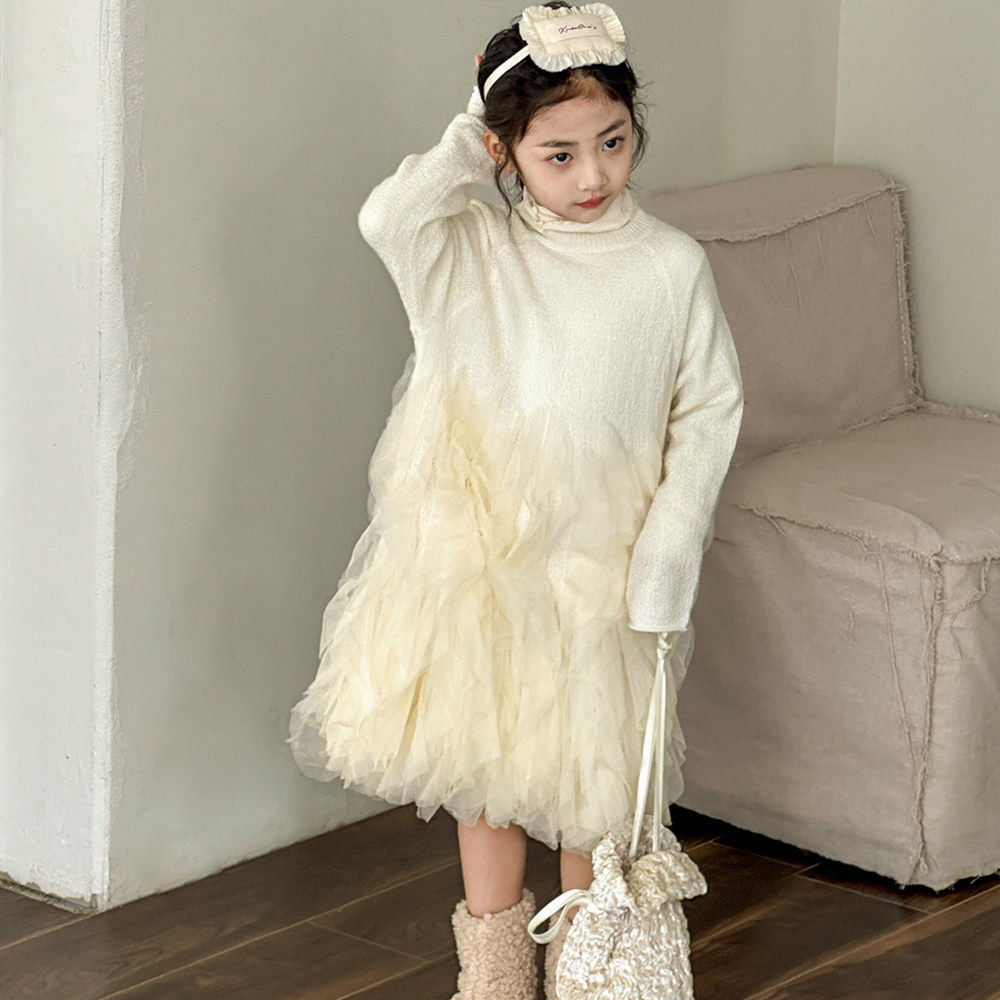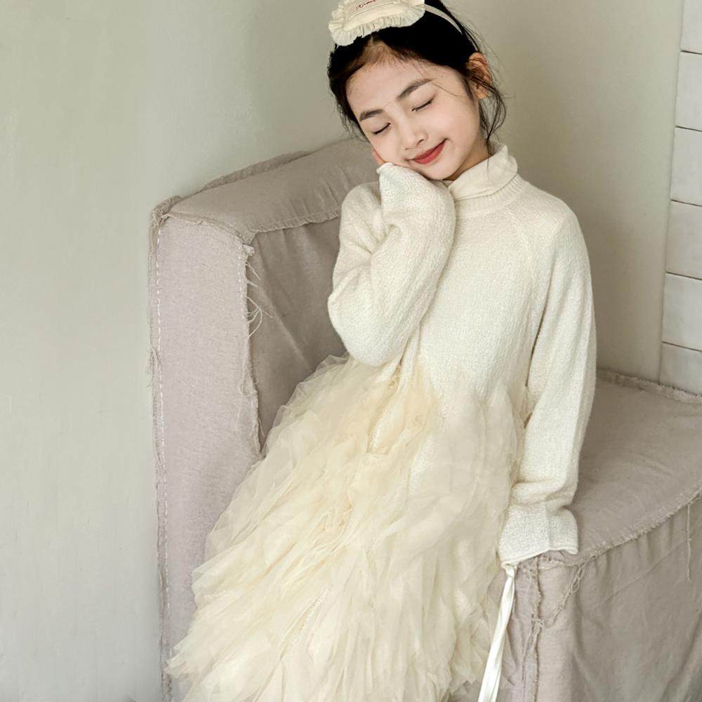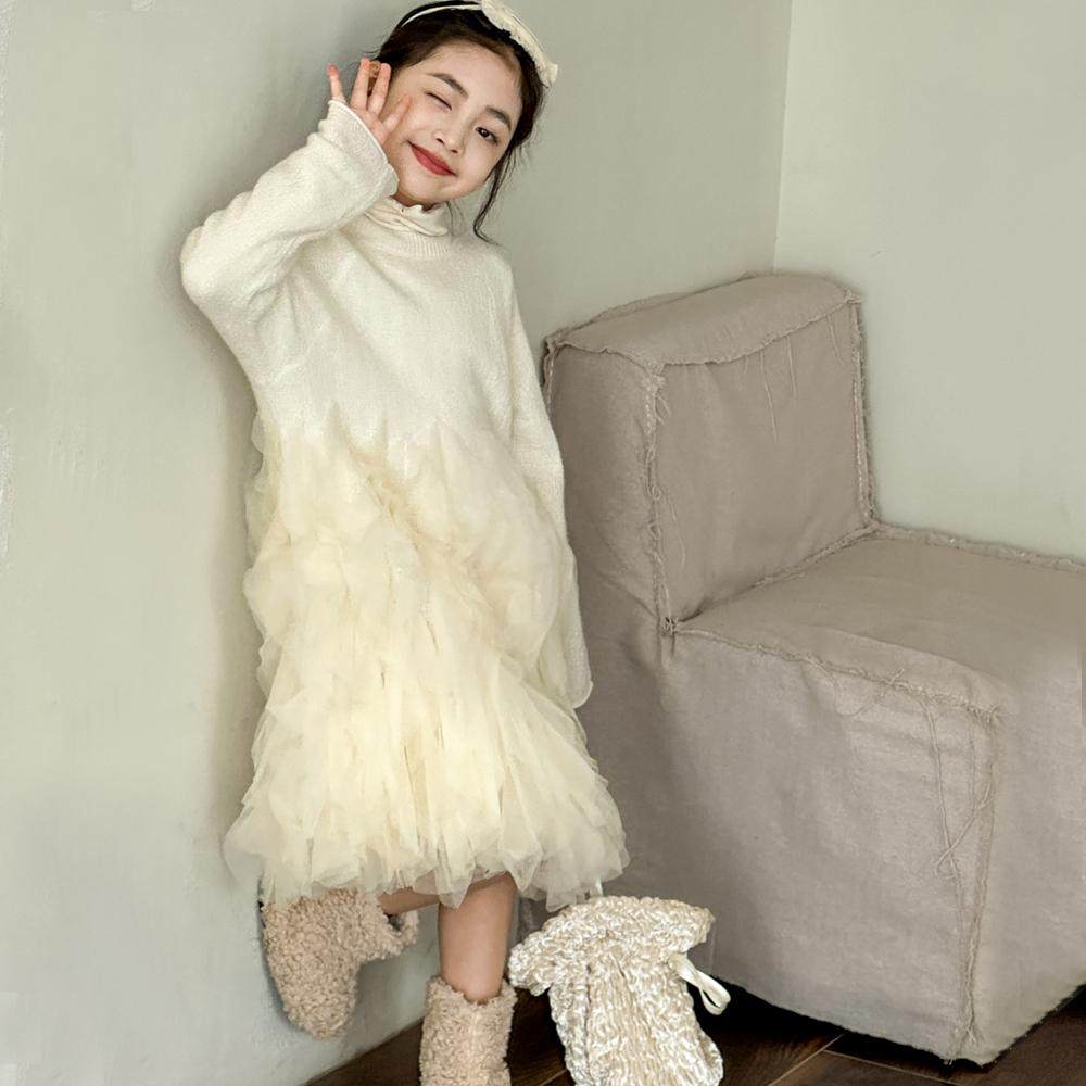 女童连衣裙秋冬款女大童针织拼接网纱裙女孩冬季公主裙儿童蛋糕裙
