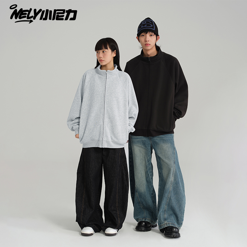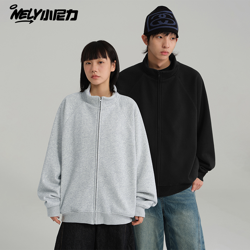 NELY小尼力美式高街立领纯色开衫卫衣运动男女秋冬拉链加绒外套潮
