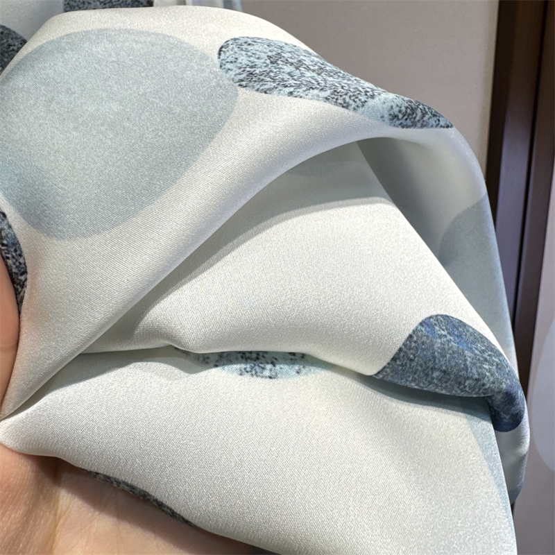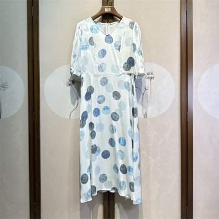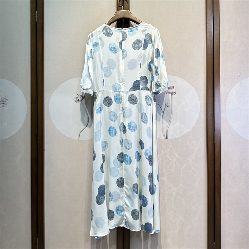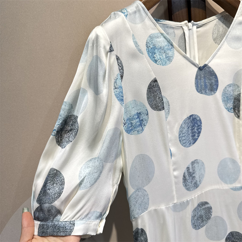 真丝弹力双乔圆点印花连衣裙百搭时尚V领五分袖桑蚕丝A字裙