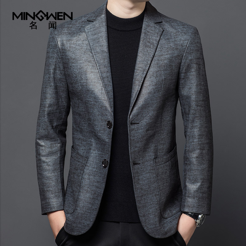 真皮皮衣休闲西服男秋冬薄款韩版修身高级感帅气印花牛皮西装外套