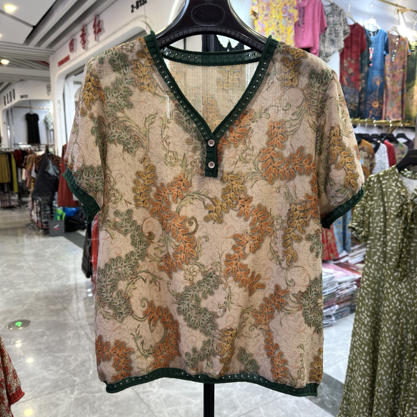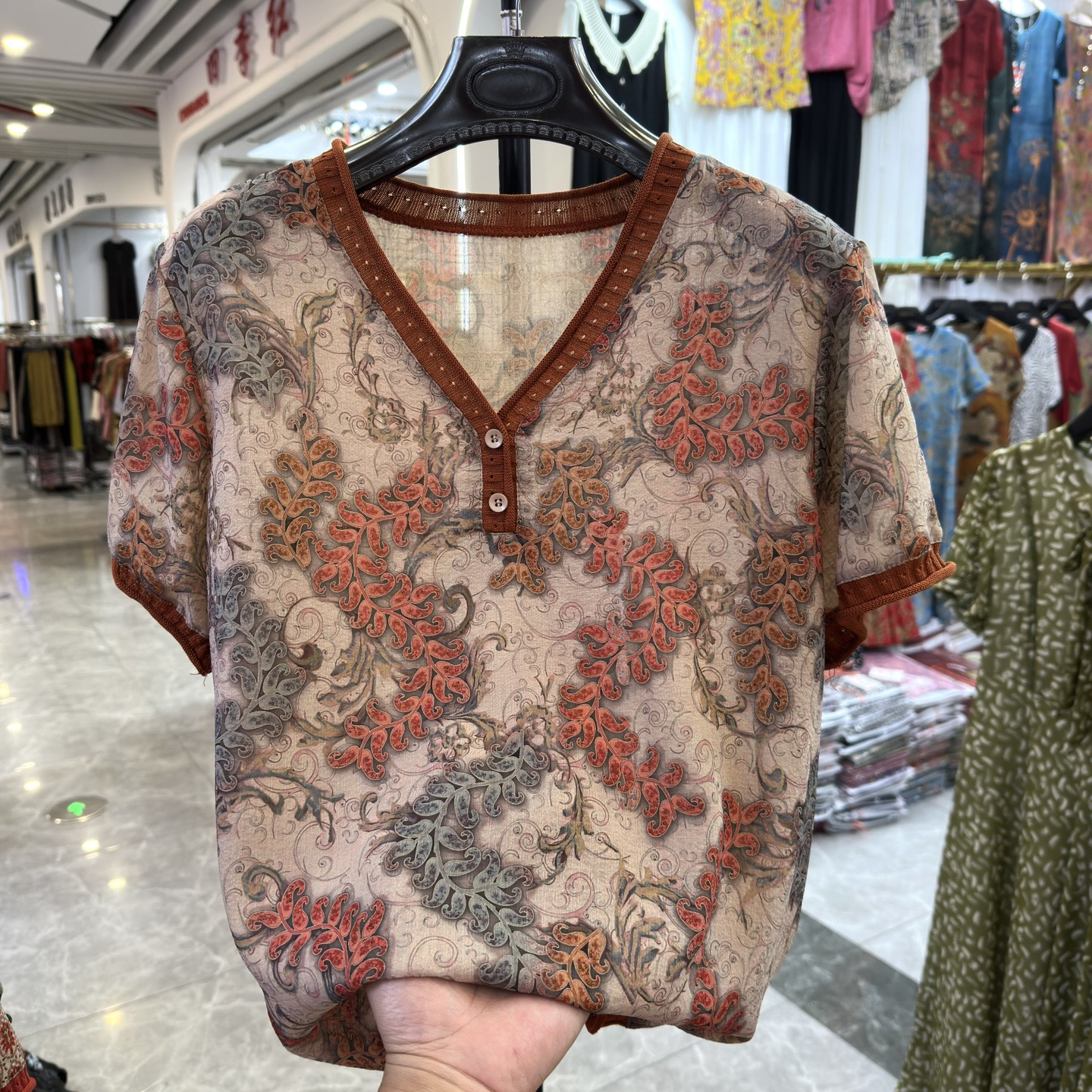 年轻妈妈装V领拼接印花短袖T恤2025夏新款洋气宽松遮肉中老年上衣