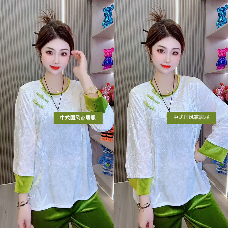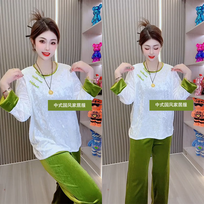 秋季金丝绒睡衣套装长袖圆领气质洋气时尚休闲宽松中式国风家居服