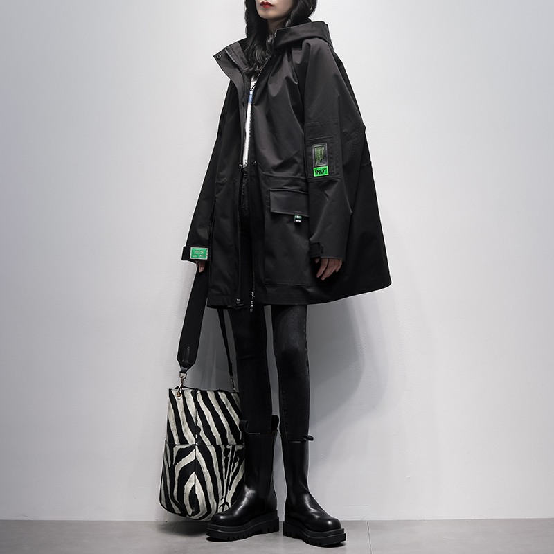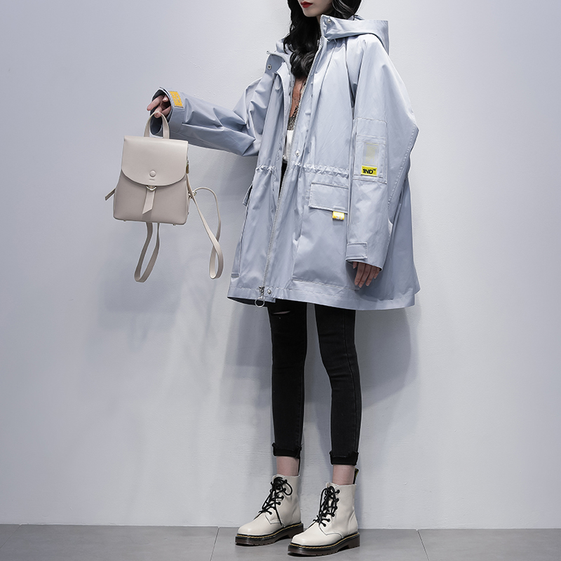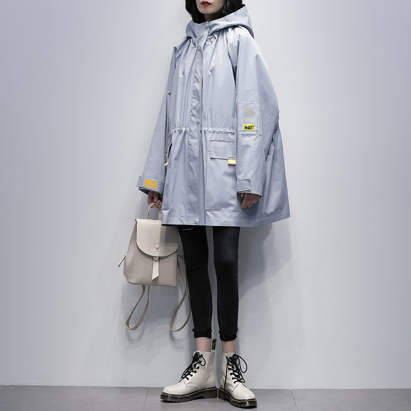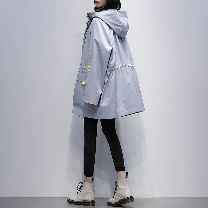 黑色风衣女中长款2025秋季新款韩版连帽休闲抽绳收腰宽松显瘦外套