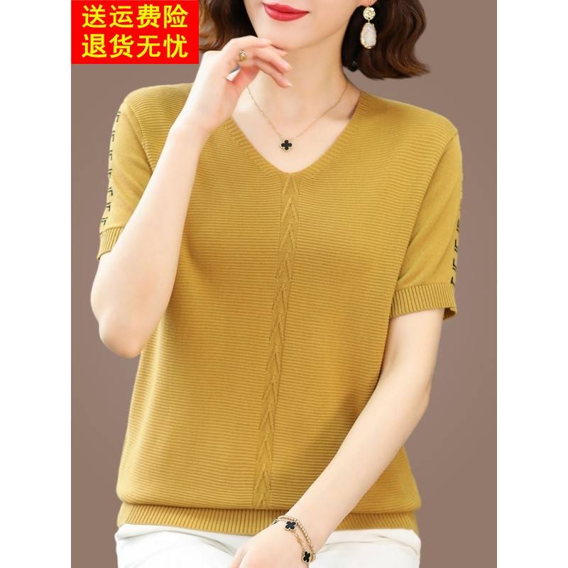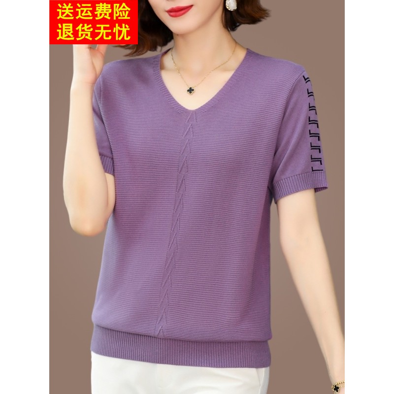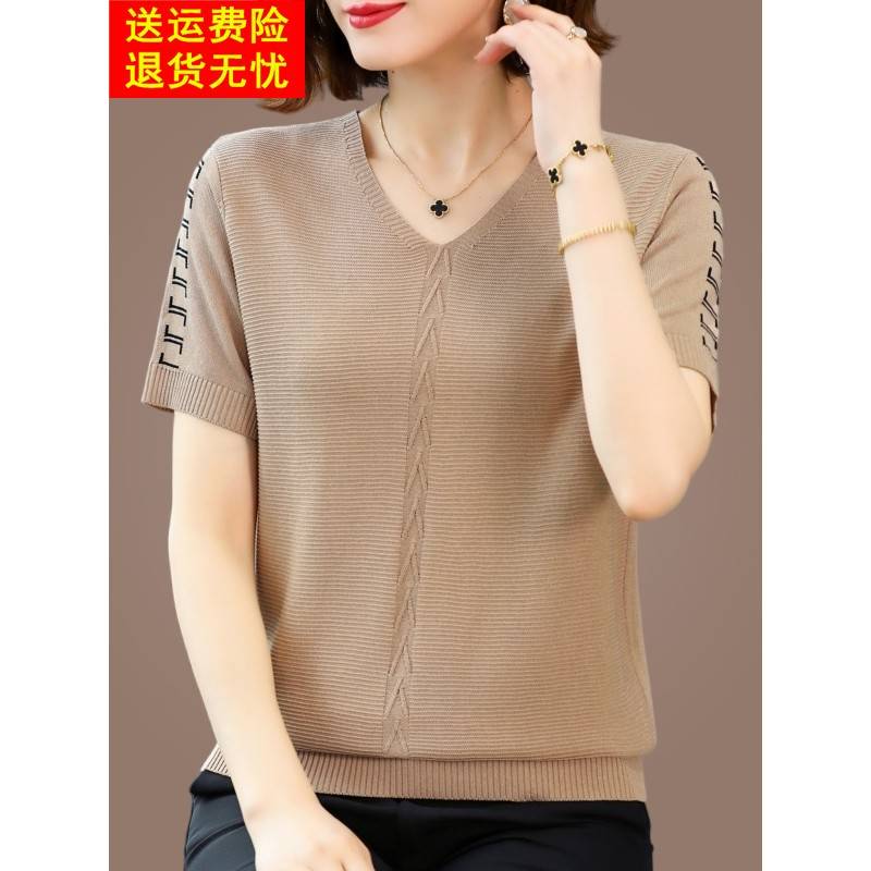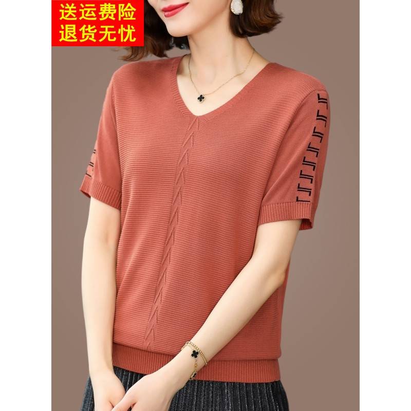 2025V领t恤女夏季新款桑蚕丝针织中年妈妈装大码洋气冰丝短袖上衣