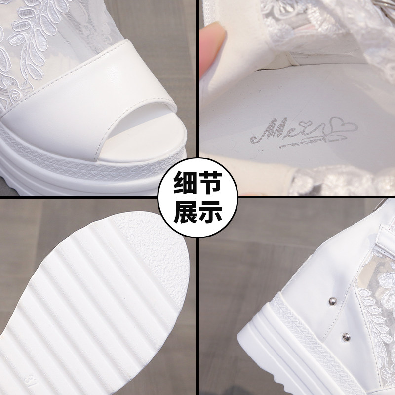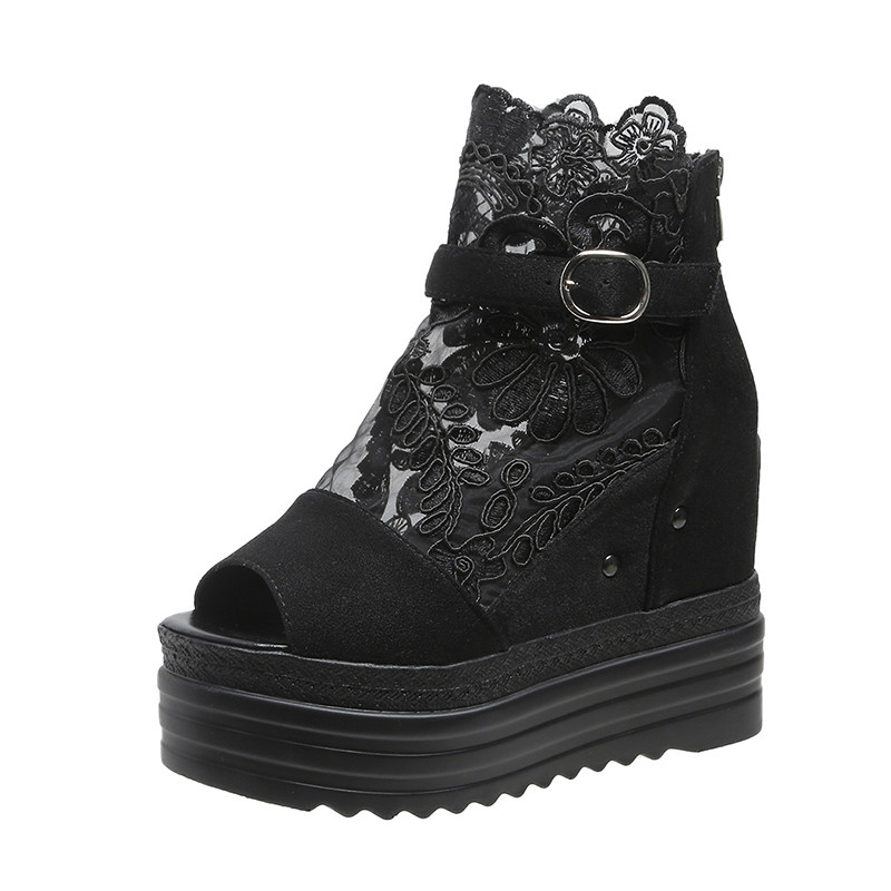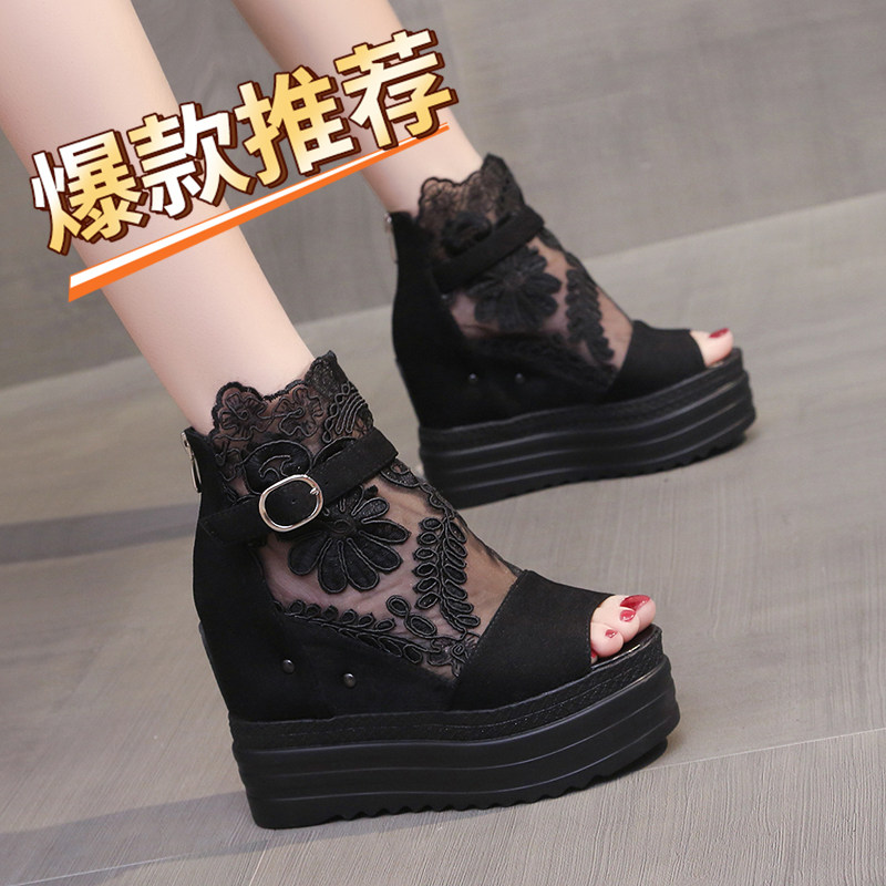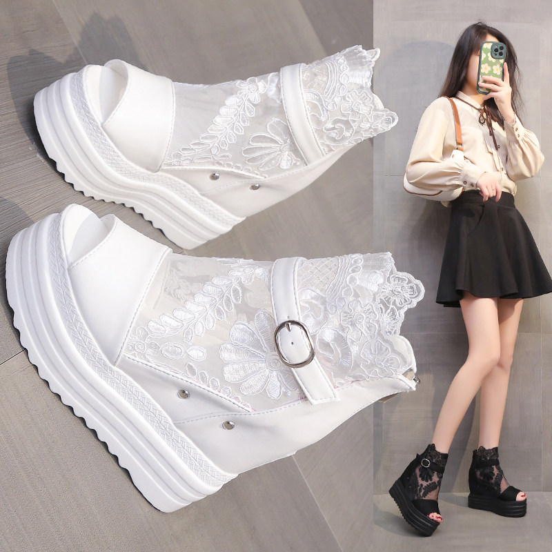 春季新款鱼嘴凉鞋女松糕跟防水台厚底内增高蕾丝高帮坡跟百搭凉靴