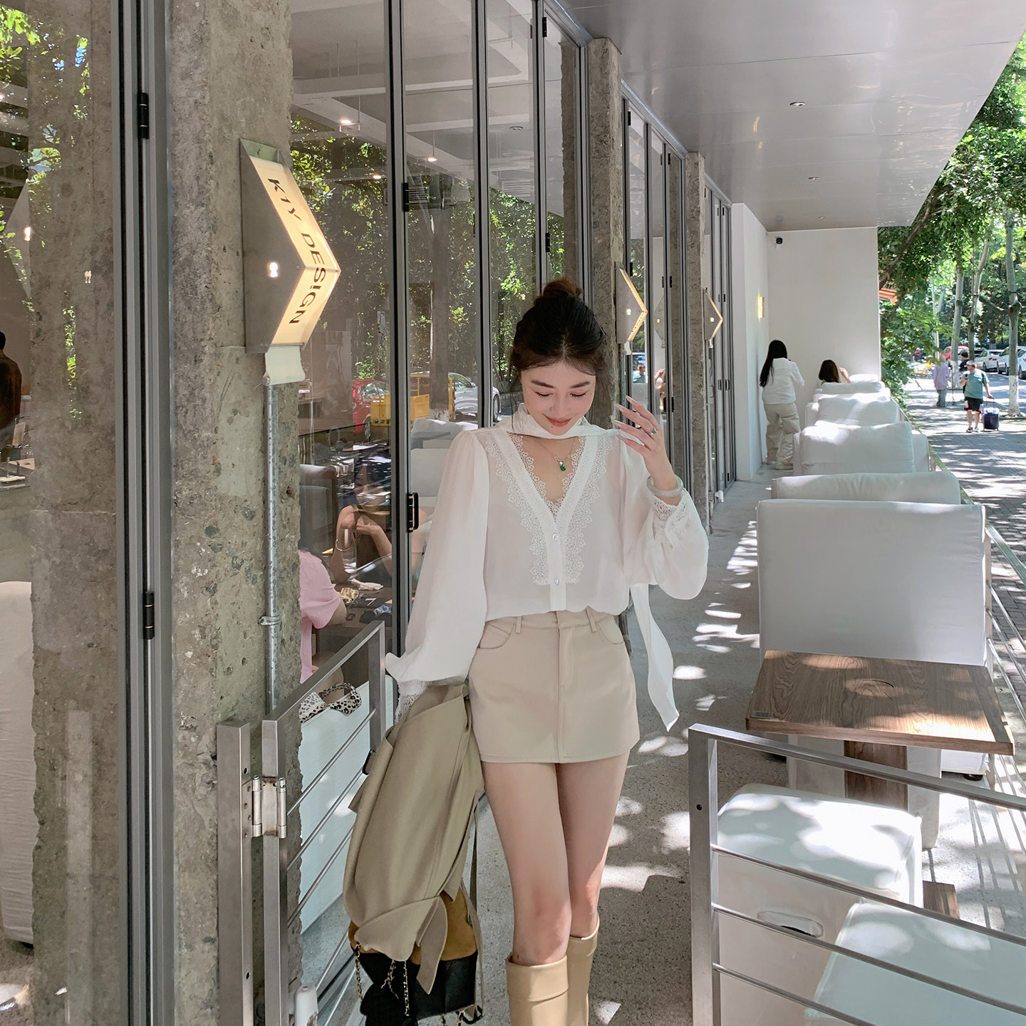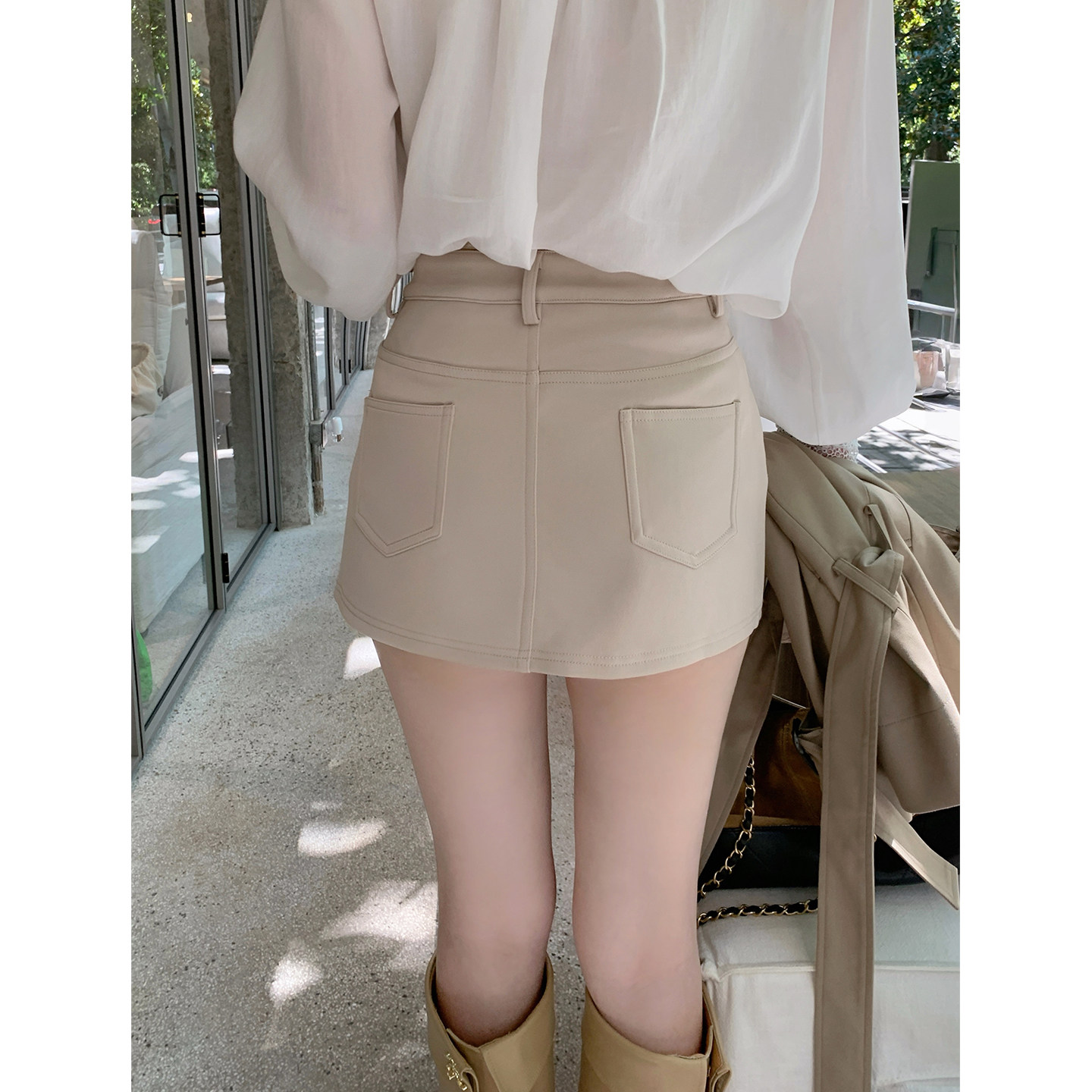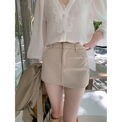 ByYou 秋季新款蕾丝拼接缎面西装半身裙女短款高腰修身a字包臀裙
