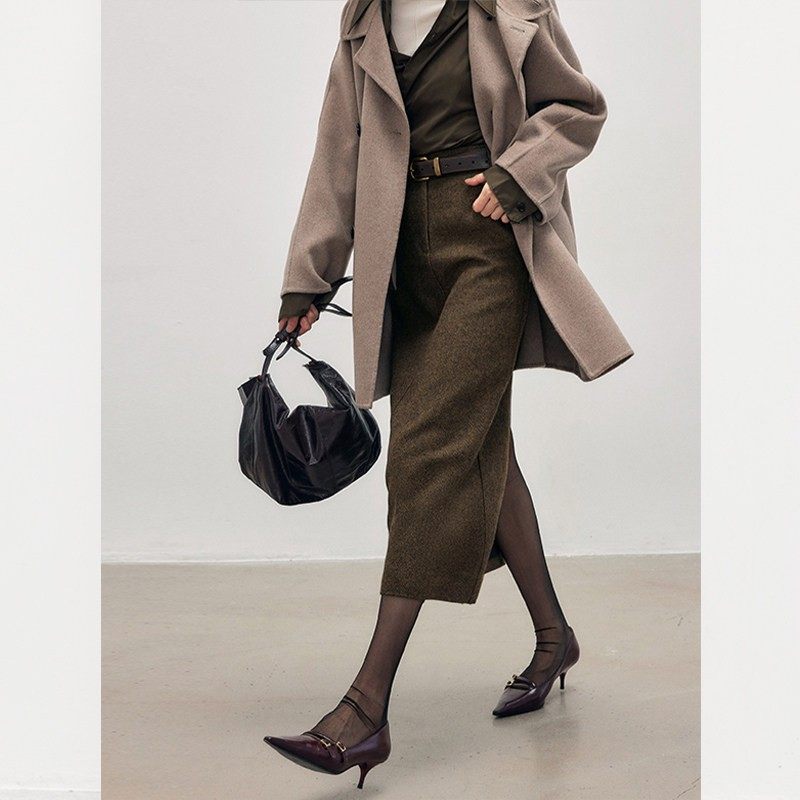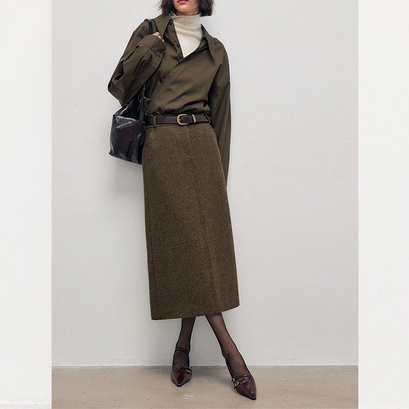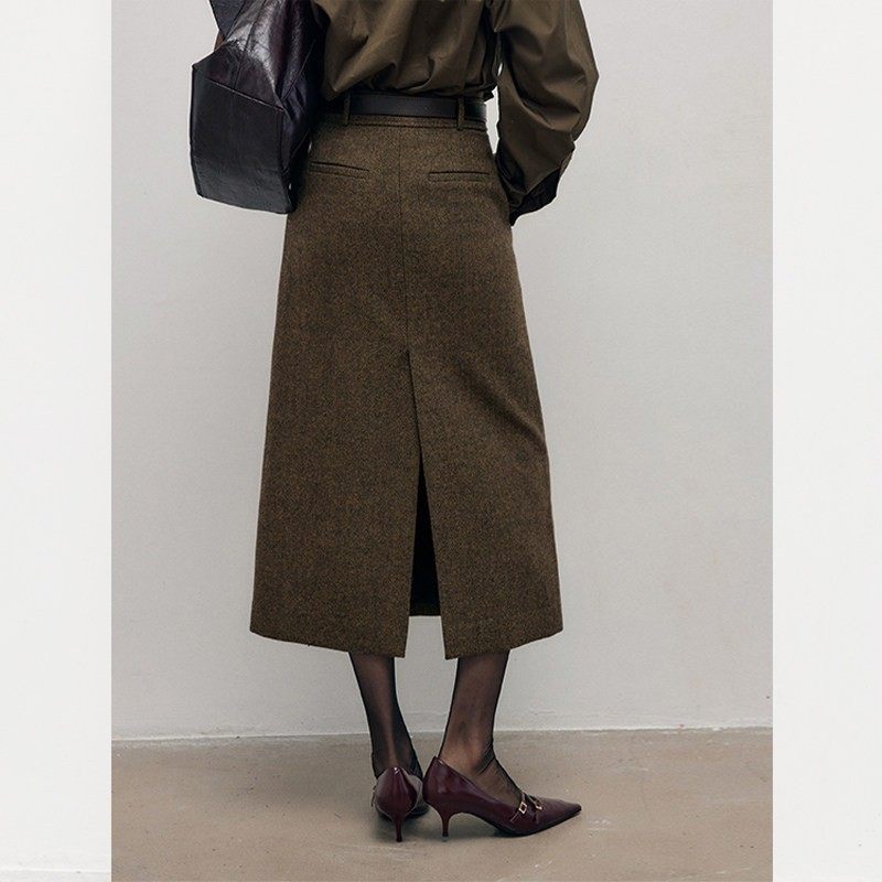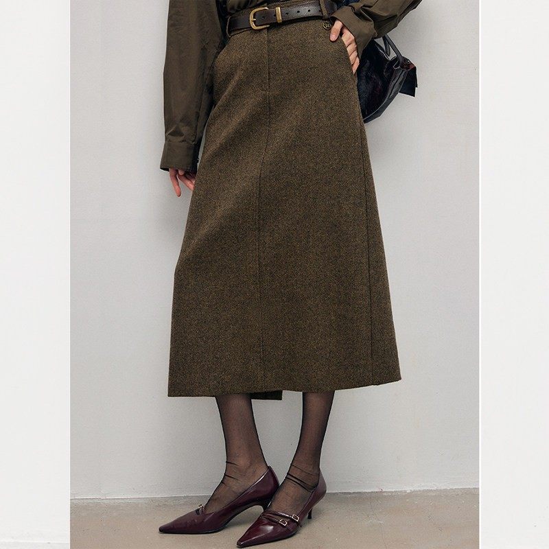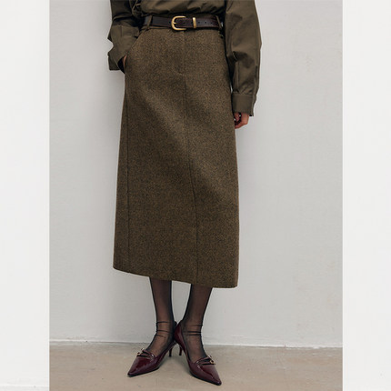 时尚开叉毛呢半身裙女装秋冬新款垂感高腰百搭人字纹a字裙子气质