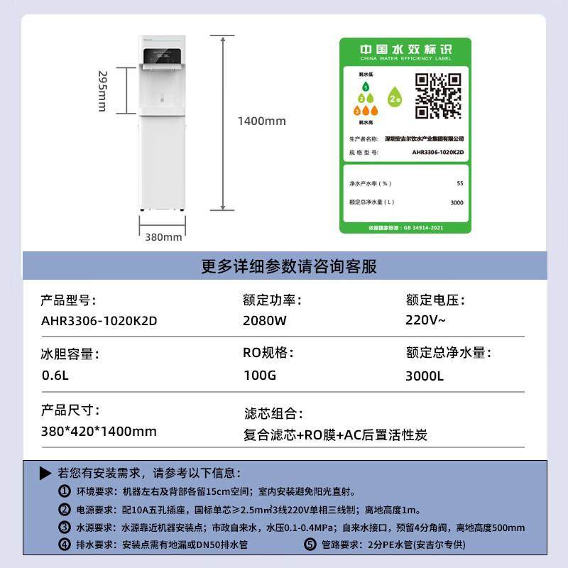 AHR3301-1015K2D 安吉尔饮水机净饮一体反渗透净水器冰热款纯水机