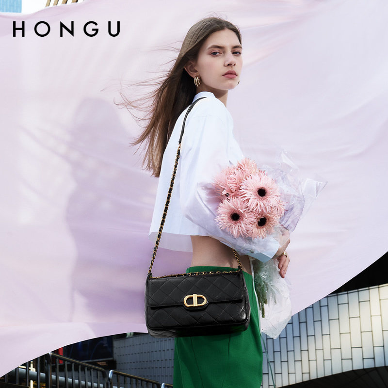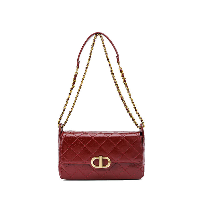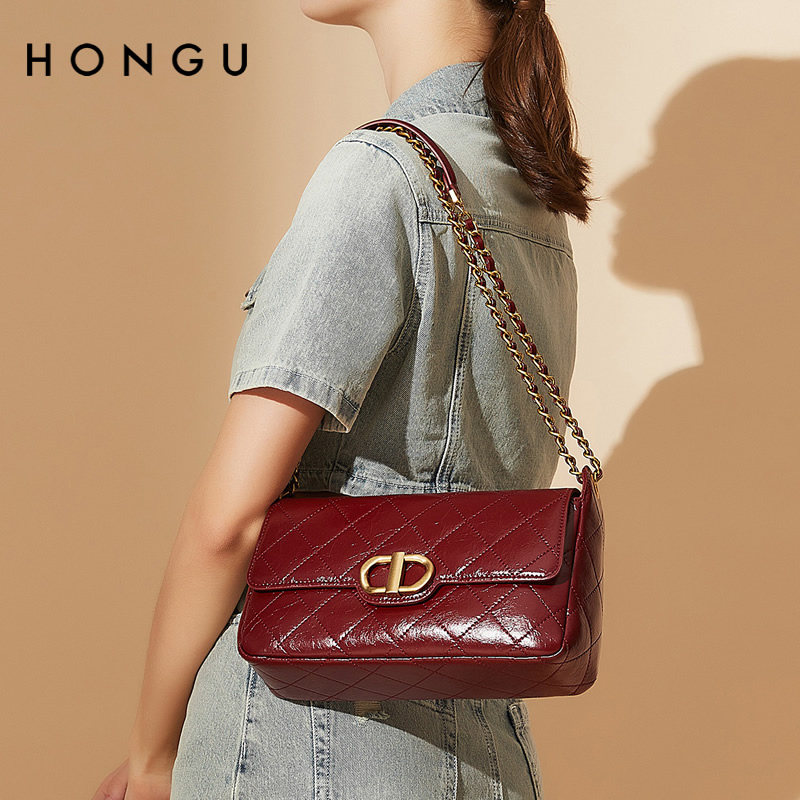 红谷女包轻奢腋下包头层牛皮休闲菱格链条包皱褶皮单肩斜挎包婚包
