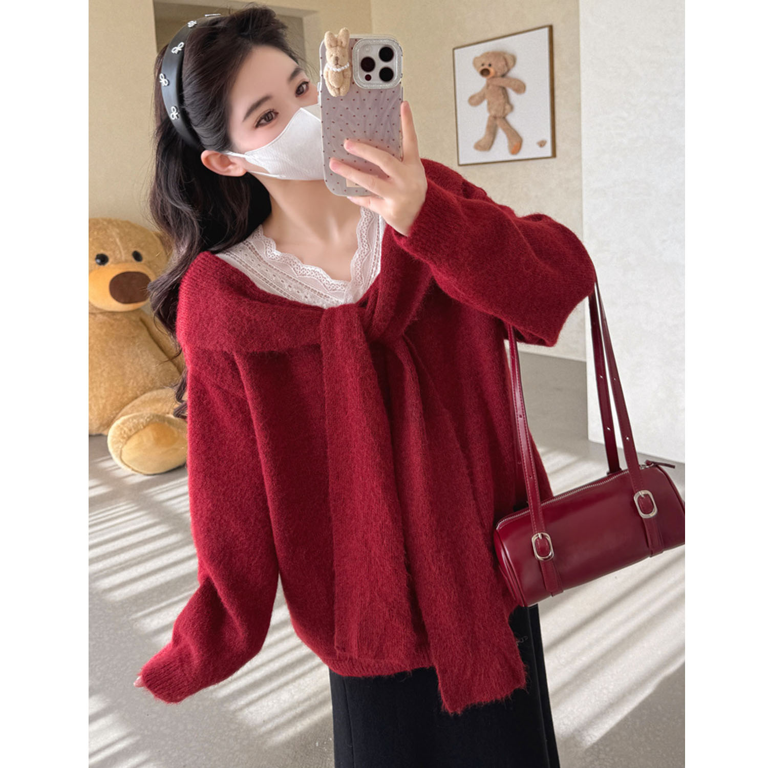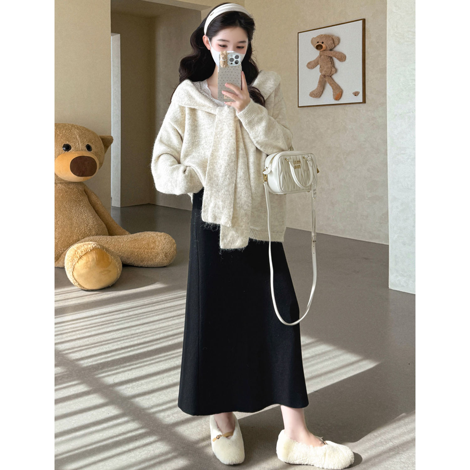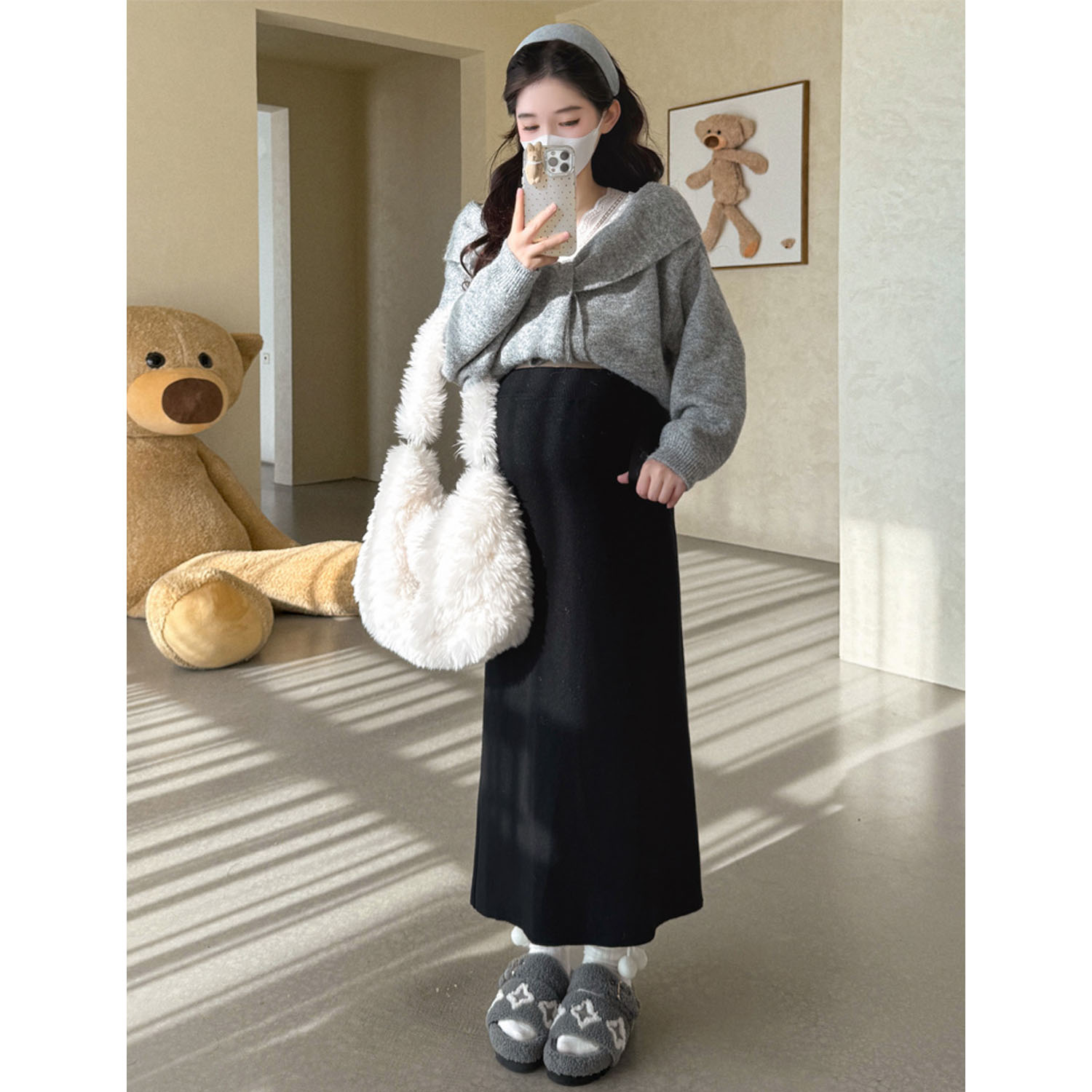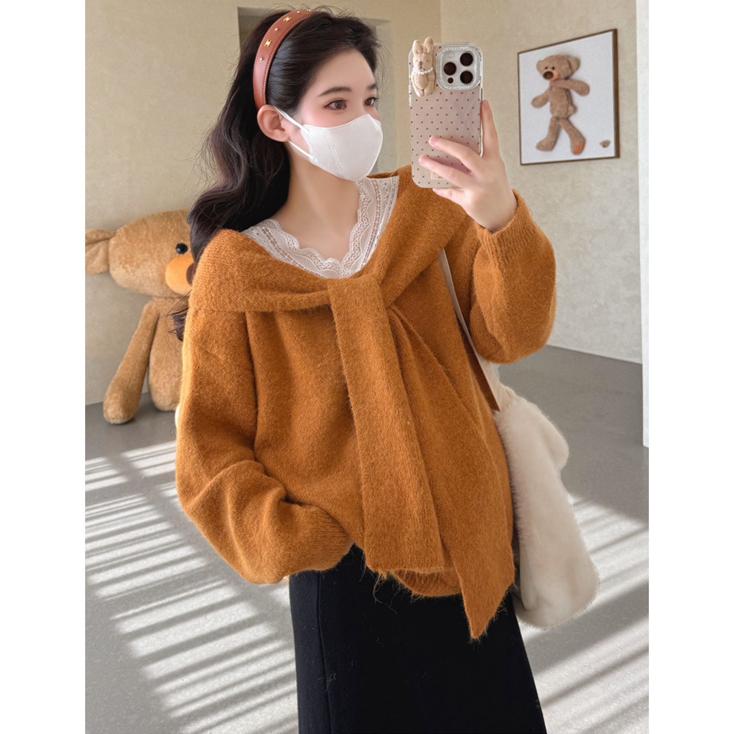 孕妇装2025新款蕾丝拼接V领绑带长袖毛衣A字针织半身裙秋装两件套