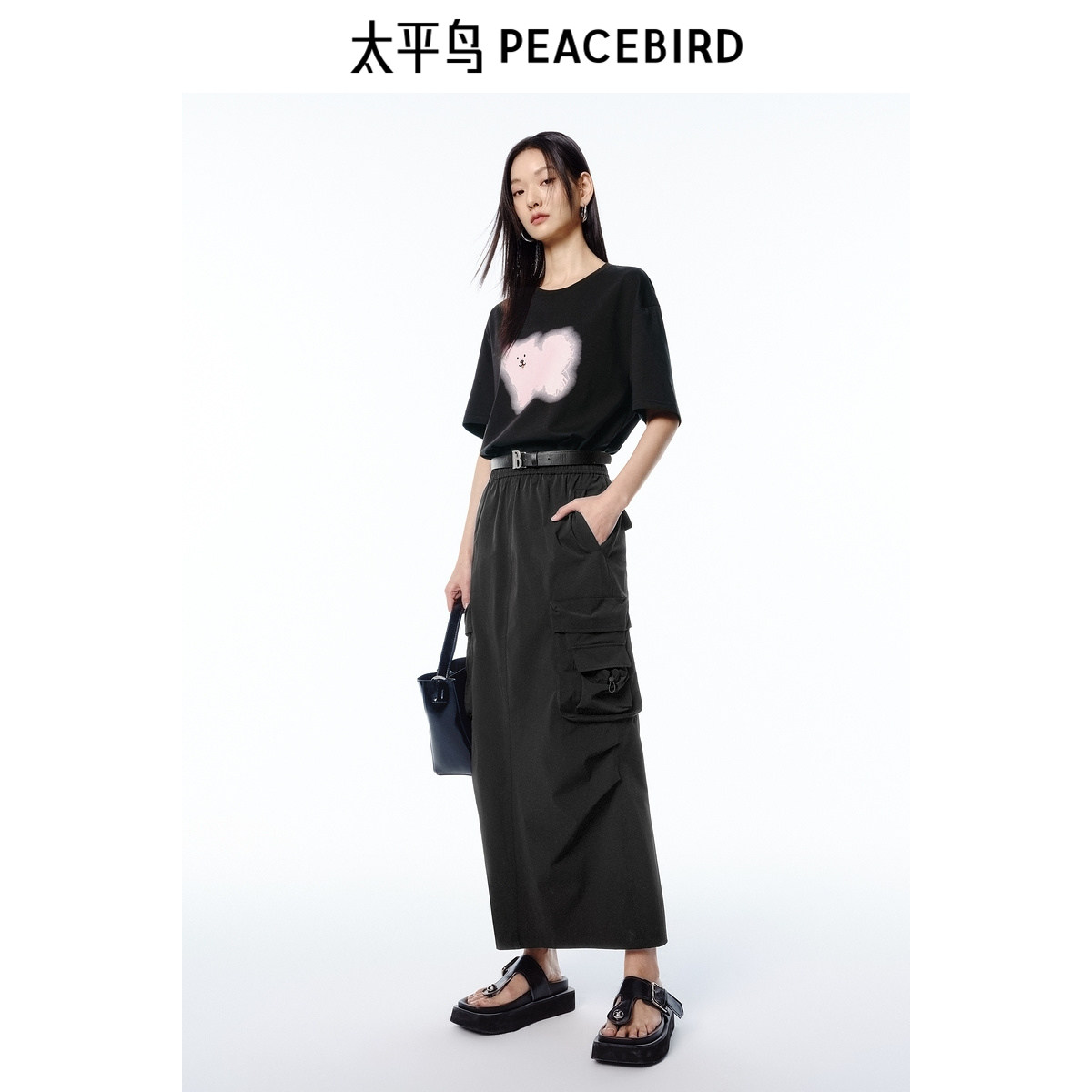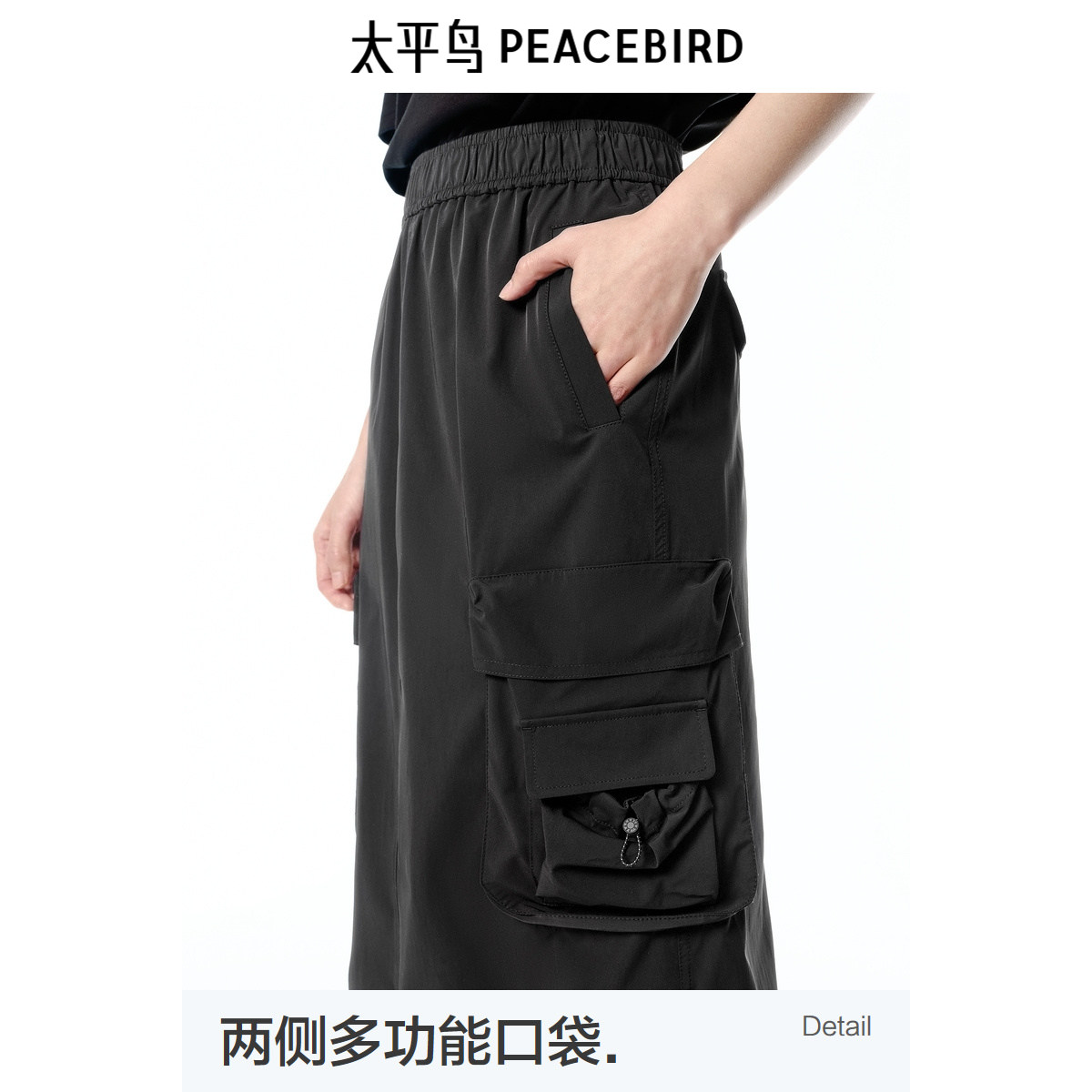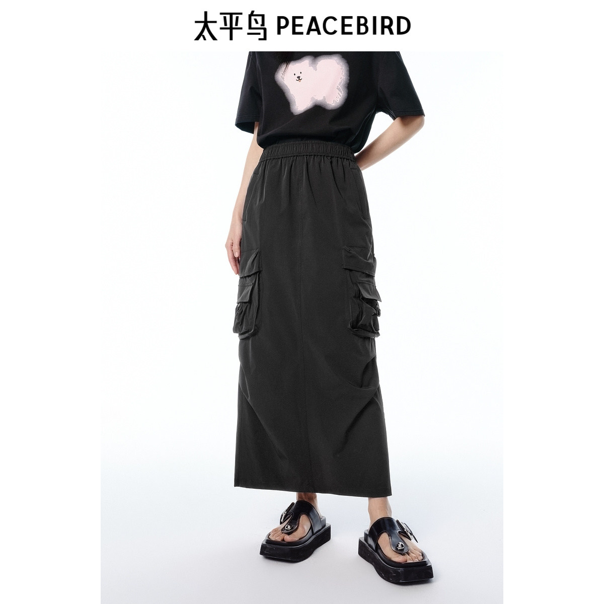 太平鸟工装风半身裙女长裙2025夏新款轻薄挺括黑色运动风直筒裙子